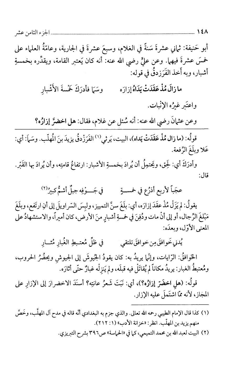 أبو حنيفة: ثماني عشرة سنةً في الغلام، وسبع عشرة في الجارية، وعامة العلماء على خمس عشرة فيهما. وعن علي رضي الله عنه: أنه كان يعتبر القامة، ويقدره بخمسة أشبار، وبه أخذ الفرزدق في قوله: