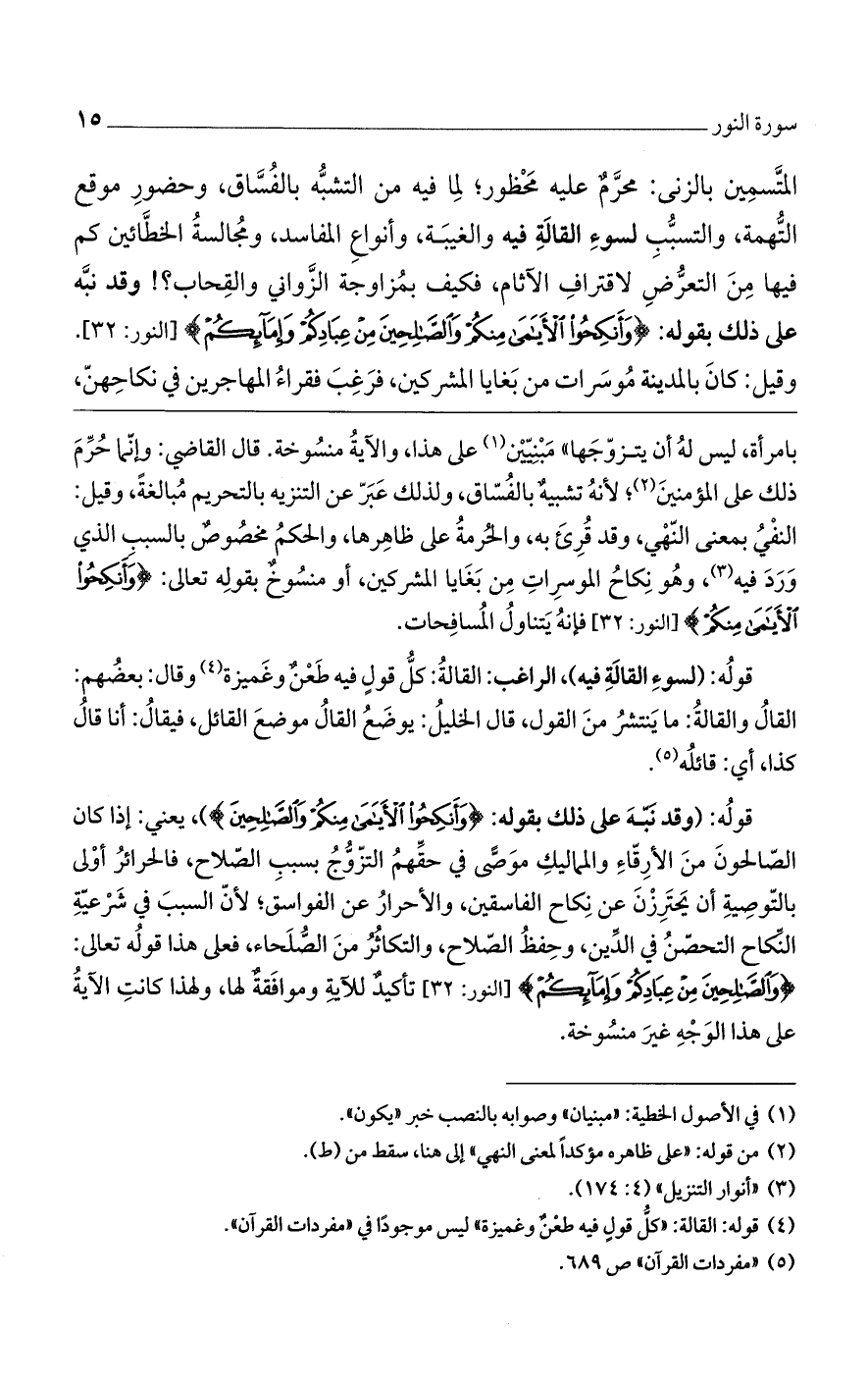 قوله: (وقد نبه على ذلك بقوله: {وَأَنْكِحُوا الْأَيَامَى مِنْكُمْ وَالصَّالِحِينَ}، يعني: إذا كان الصالحون من الأرقاء والمماليك موصى في حقهم التزوج بسبب الصلاح، فالحرائر أولى بالتوصية أن يحترزن عن نكاح الفاسقين، والأحرار عن الفواسق، لأن السبب في شرعية النكاح التحصن في الدين، وحفظ الصلاح، والتكاثر من الصلحاء، فعلى هذا قوله تعالى: {وَالصَّالِحِينَ مِنْ عِبَادِكُمْ وَإِمَائِكُمْ} [النور: 32] تأكيدٌ للآية وموافقةٌ لها، ولهذا كانت الآية على هذا الوجه غير منسوخة.