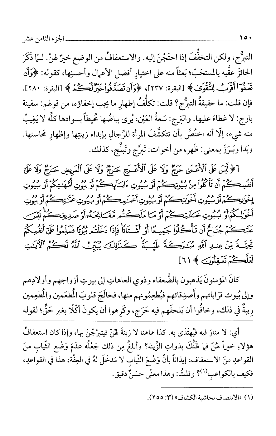 التبرج، ولكن التخفف إذا احتجن إليه. والاستعفاف من الوضع خيرٌ لهن. لما ذكر الجائز عقبه بالمستحب، بعثاً منه على اختيار أفضل الأعمال وأحسنها، كقوله: {وَأَنْ تَعْفُوا أَقْرَبُ لِلتَّقْوَى} [البقرة: 237]، {وَأَنْ تَصَدَّقُوا خَيْرٌ لَكُمْ} [البقرة: 280]. فإن قلت: ما حقيقة التبرج؟ قلت: تكلف إظهار إخفاؤه، من قولهم: سفينة بارج: لا غطاء عليها. والبرج: سعة العين، يرى بياضها محيطاً بسوادها كله لا يغيب منه شيء، إلا أنه اختص بأن تتكشف المرأة للرجال بإبداء زينتها وإظهار محاسنها. وبدا وبرز بمعنى: ظهر، من أخوات: تبرج وتبلج، كذلك.