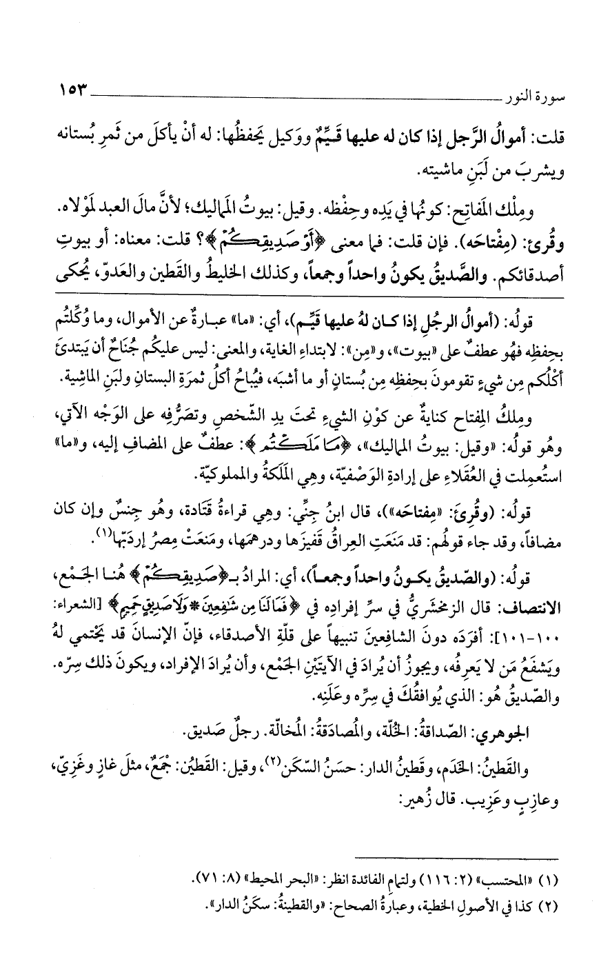 وملك المفاتح: كونها في يده وحفظه. وقيل: بيوت المماليك، لأن مال العبد لمولاه. وقرئ: (مفتاحه). فإن قلت: فما معنى {أَوْ صَدِيقِكُمْ}؟ قلت: معناه: أو بيوت أصدقائكم. والصديق يكون واحداً وجمعاً، وكذلك الخليط والقطين والعدو، يحكى
