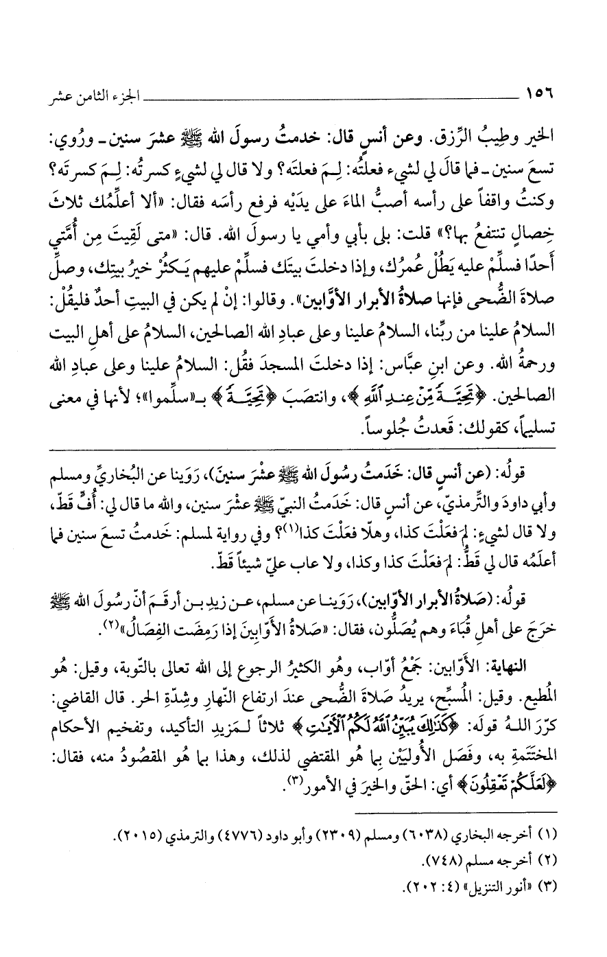 قوله: (عن أنسٍ قال: خدمت رسول الله - صلى الله عليه وسلم - عشر سنين)، روينا عن البخاري ومسلم وأبي داود والترمذي، عن أنسٍ قال: خدمت النبي عشر سنين، والله ما قال لي: أفٍّ قط، ولا قال لشيءٍ: لم فعلت كذا، وهلا فعلت كذا؟ وفي رواية لمسلم: خدمت تسع سنين فما أعلمه قال لي قط: لم فعلت كذا وكذا، ولا عاب علي شيئاً قط.