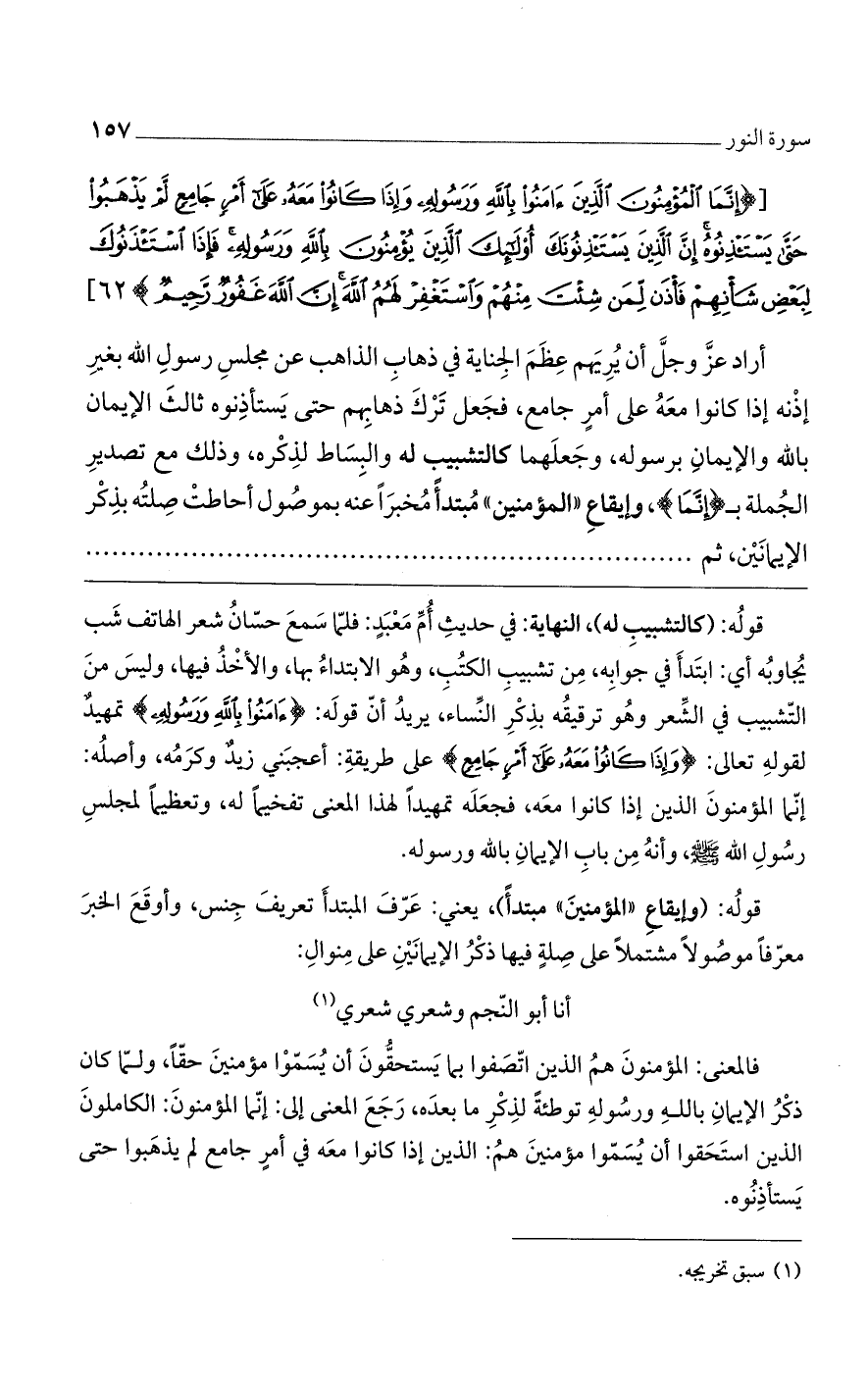 قوله: (كالتشبيب له)، النهاية: في حديث أم معبدٍ: فلما سمع حسان شعر الهاتف شب يجاوبه أي: ابتدأ في جوابه، من تشبيب الكتب، وهو الابتداء بها، والأخذ فيها، وليس من التشبيب في الشعر وهو ترقيقه بذكر النساء، يريد أن قوله: {آَمَنُوا بِاللَّهِ وَرَسُولِهِ} تمهيدٌ لقوله تعالى: {وَإِذَا كَانُوا مَعَهُ عَلَى أَمْرٍ جَامِعٍ} على طريقة: أعجبني زيدٌ وكرمه، وأصله: إنما المؤمنون الذين إذا كانوا معه، فجعله تمهيداً لهذا المعنى تفخيماً له، وتعظيماً لمجلس رسول الله - صلى الله عليه وسلم -، وأنه من باب الإيمان بالله ورسوله.