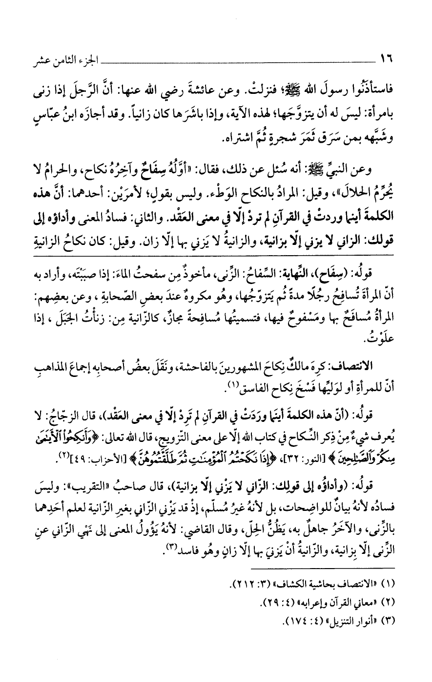 وعن النبي - صلى الله عليه وسلم -: أنه سئل عن ذلك، فقال: "أوله سفاحٌ وآخره نكاح، والحرام لا يحرم الحلال"، وقيل: المراد بالنكاح الوطء. وليس بقول، لأمرين: أحدهما: أن هذه الكلمة أينما وردت في القرآن لم ترد إلا في معنى العقد. والثاني: فساد المعنى وأداؤه إلى قولك: الزاني لا يزنى إلا بزانية، والزانية لا يزني بها إلا زان. وقيل: كان نكاح الزانية