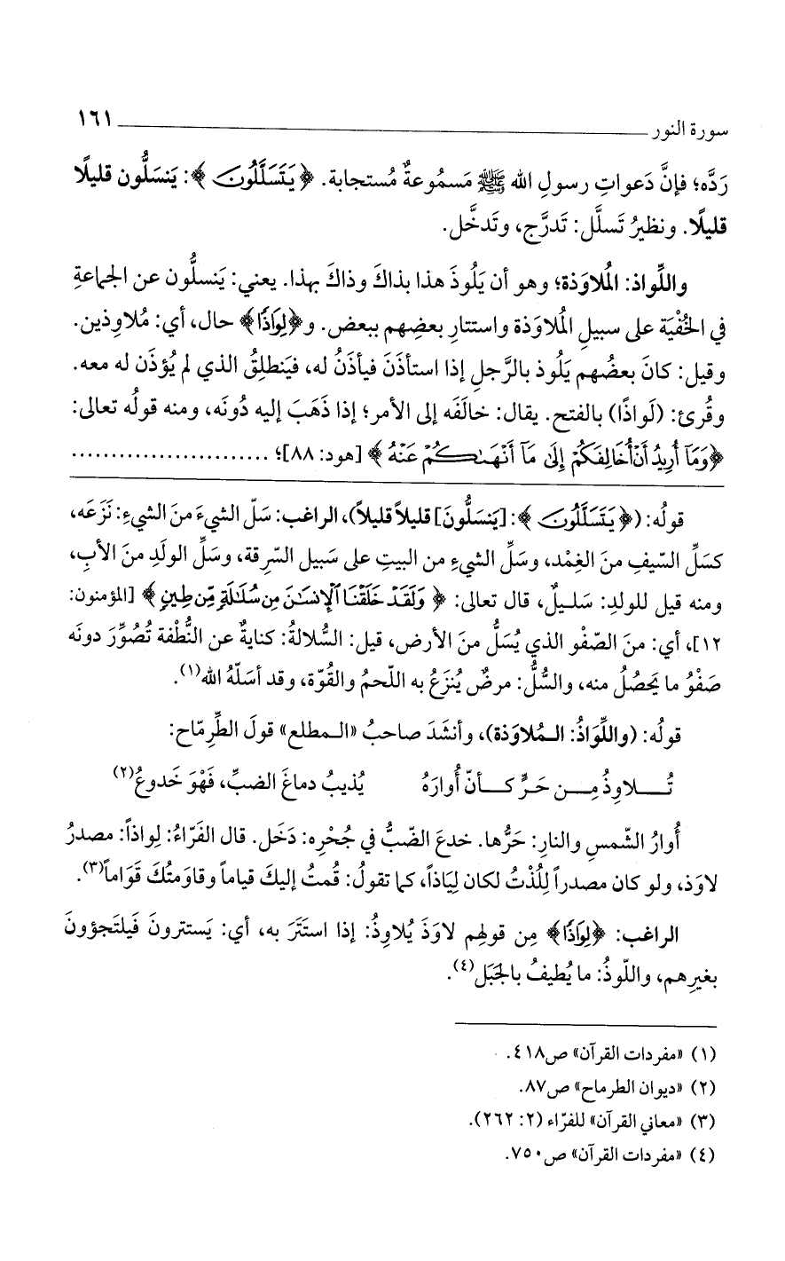 رده، فإن دعوات رسول الله - صلى الله عليه وسلم - مسموعةٌ مستجابة. {يَتَسَلَّلُونَ}: ينسلون قليلاً قليلاً. ونظير تسلل: تدرج، وتدخل.