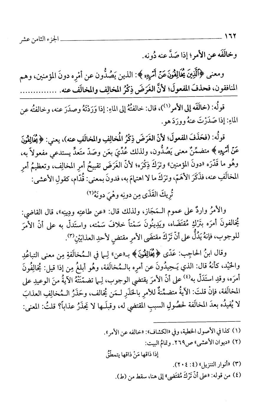 وقال ابن الحاجب: عدى {يُخَالِفُونَ} بـ "عن" لما في المخالفة من معنى التباعد والحيد، كأنه قال: الذي يحيدون عن أمره بالمخالفة، وهو أبلغ من إذا قيل: يخالفون أمره، وقد استدل به على أن الأمر يقتضي الوجوب، لما تضمنته الآية من الوعيد على المخالفة، فإن قلت: الآية متضمنةٌ للأمر بالحذر لمن يخالف، وحذر المخالف العذاب لا يفيده بعد المخالفة لحصول السبب المقتضي له، وقبلها لا يحذر عذاباً؟ قلت: المعنى: