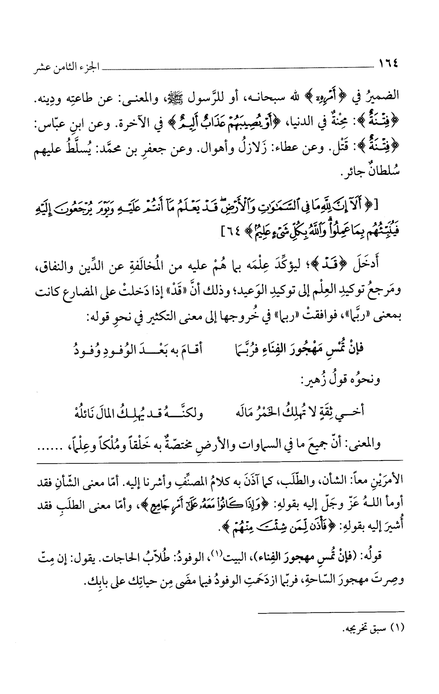 قوله: (فإن تمس مهجور الفناء)، البيت، الوفود: طلاب الحاجات. يقول: إن مت وصرت مهجور الساحة، فربما ازدحمت الوفود فيما مضى من حياتك على بابك.