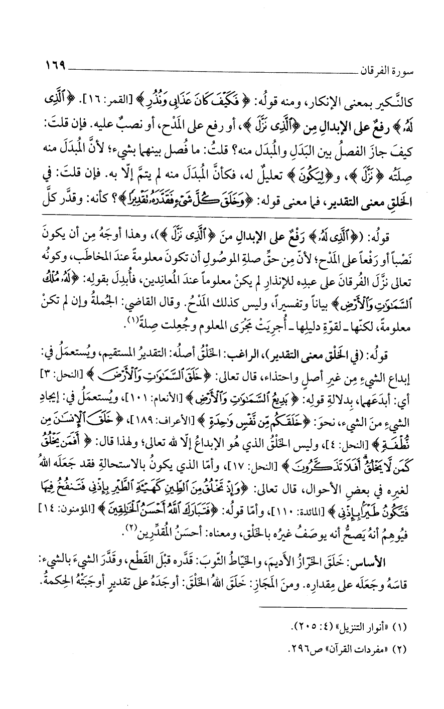 كالنكير بمعنى الإنكار، ومنه قوله: {فَكَيْفَ كَانَ عَذَابِي وَنُذُرِ} [القمر: 16]. {الَّذِي لَهُ} رفعٌ على الإبدال من {الَّذِي نَزَّلَ}، أو رفع على المدح، أو نصبٌ عليه. فإن قلت: كيف جاز الفصل بين البدل والمبدل منه؟ قلت: ما فصل بينهما بشيء، لأن المبدل منه صلته {نَزَّلَ}، و {لِيَكُونَ} تعليلٌ له، فكأن المبدل منه لم يتم إلا به. فإن قلت: في الخلق معنى التقدير، فما معنى قوله: {وَخَلَقَ كُلَّ شَيْءٍ فَقَدَّرَهُ تَقْدِيرًا}؟ كأنه: وقدر كل