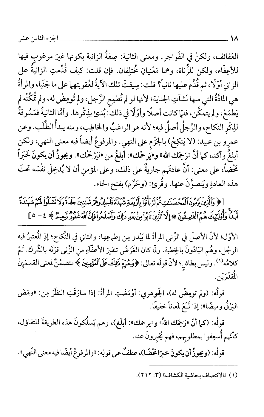 العفائف، ولكن في الفواجر. ومعنى الثانية: صفة الزانية بكونها غير مرغوب فيها للأعفاء، ولكن للزناة، وهما معنيان مختلفان. فإن قلت: كيف قدمت الزانية على الزاني أولاً، ثم قدم عليها ثانياً؟ قلت: سيقت تلك الآية لعقوبتهما على ما جنيا، والمرأة هي المادة التي منها نشأت الجناية، لأنها لو لم تطمع الرجل، ولم تومض له، ولم تمكنه لم يطمع، ولم يتمكن، فلما كانت أصلاً وأولاً في ذلك: بدئ بذكرها. وأما الثانية فمسوقةٌ لذكر النكاح، والرجل أصلٌ فيه، لأنه هو الراغب والخاطب، ومنه يبدأ الطلب. وعن عمرو بن عبيد: (لا ينكح) بالجزم على النهي. والمرفوع أيضاً فيه معنى النهي، ولكن أبلغ وآكد، كما أن "رحمك الله" و"يرحمك": أبلغ من "ليرحمك" ويجوز أن يكون خبراً محضاً، على معنى: أن عادتهم جاريةٌ على ذلك، وعلى المؤمن أن لا يدخل نفسه تحت هذه العادة ويتصون عنها. وقرئ: (وحرم) بفتح الحاء.