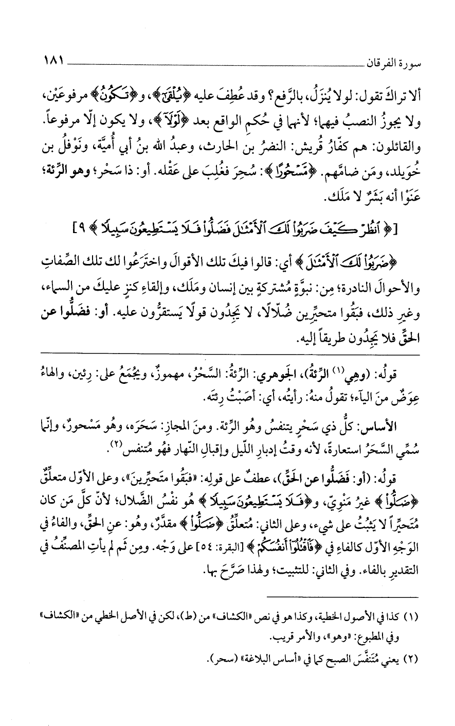 ألا تراك تقول: لولا ينزل، بالرفع؟ وقد عطف عليه {يُلْقَى}، و {تَكُونُ} مرفوعين، ولا يجوز النصب فيهما، لأنهما في حكم الواقع بعد {لَوْلَا}، ولا يكون إلا مرفوعاً. والقائلون: هم كفار قريش: النضر بن الحارث، وعبد الله بن أبي أمية، ونوفل بن خويلد، ومن ضامهم. {مَسْحُورًا}: سحر فغلب على عقله. أو: ذا سحر، وهو الرئة، عنوا أنه بشرٌ لا ملك.