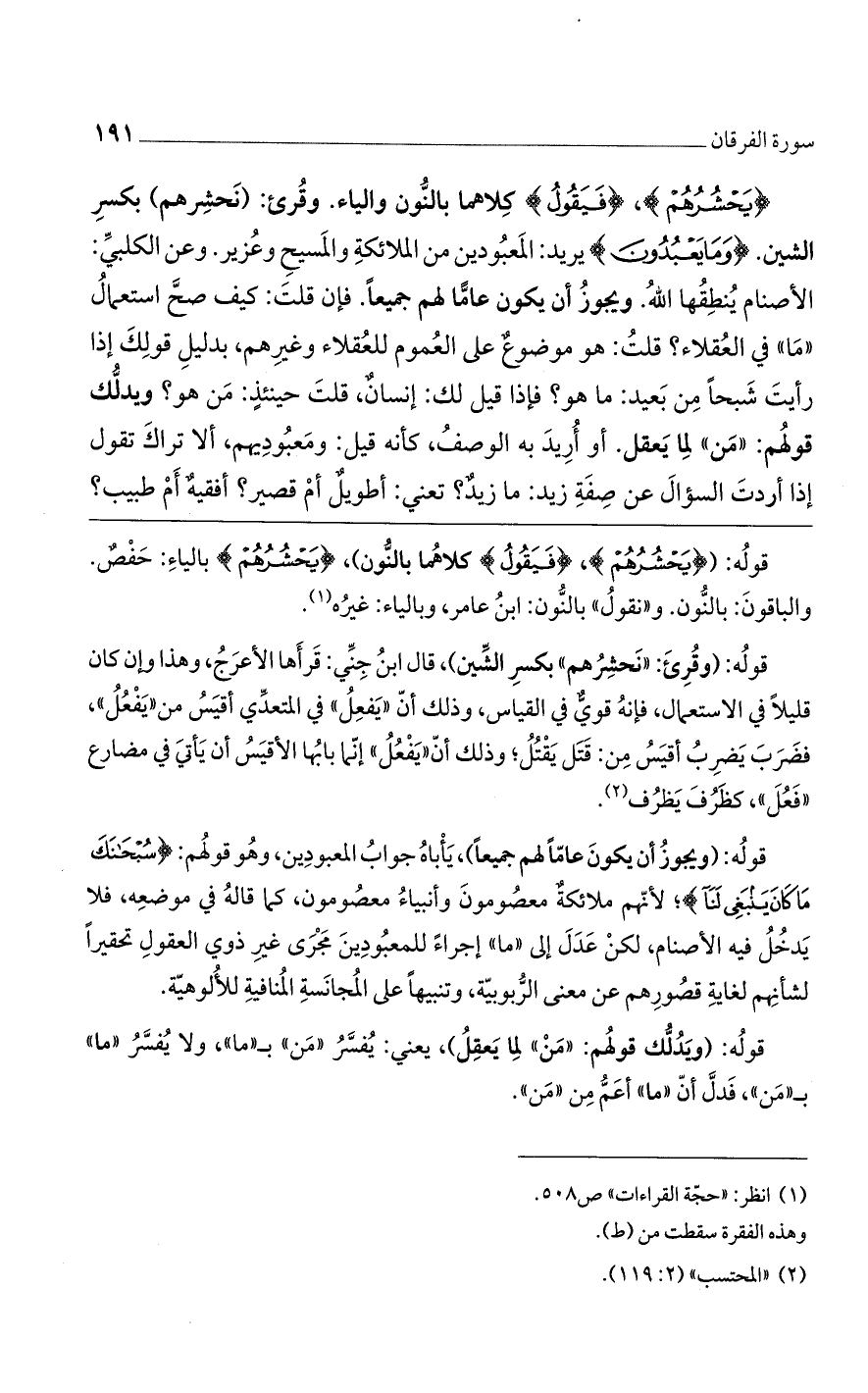 (يَحْشُرُهُمْ)، (فَيَقُولُ) كلاهما بالنون والياء، وقرئ: (نَحشِرهم) بكسر الشين (وَما يَعْبُدُونَ) يريد: المعبودين من الملائكة والمسيح وعزير. وعن الكلبي: الأصنام ينطقها الله. ويجوز أن يكون عاما لهم جميعا. فإن قلت: كيف صحّ استعمال ما في العقلاء؟ قلت: هو موضوع على العموم للعقلاء وغيرهم، بدليل قولك - إذا رأيت شبحا من بعيد-: ما هو؟ فإذا قيل لك: إنسان، قلت حينئذ: من هو؟ ويدلك قولهم «من» لما يعقل. أو أريد به الوصف، كأنه قيل: ومعبوديهم. ألا تراك تقول إذا أردت السؤال عن صفة زيد: ما زيد؟ تعنى: أطويل أم قصير؟ أفقيه أم طبيب؟