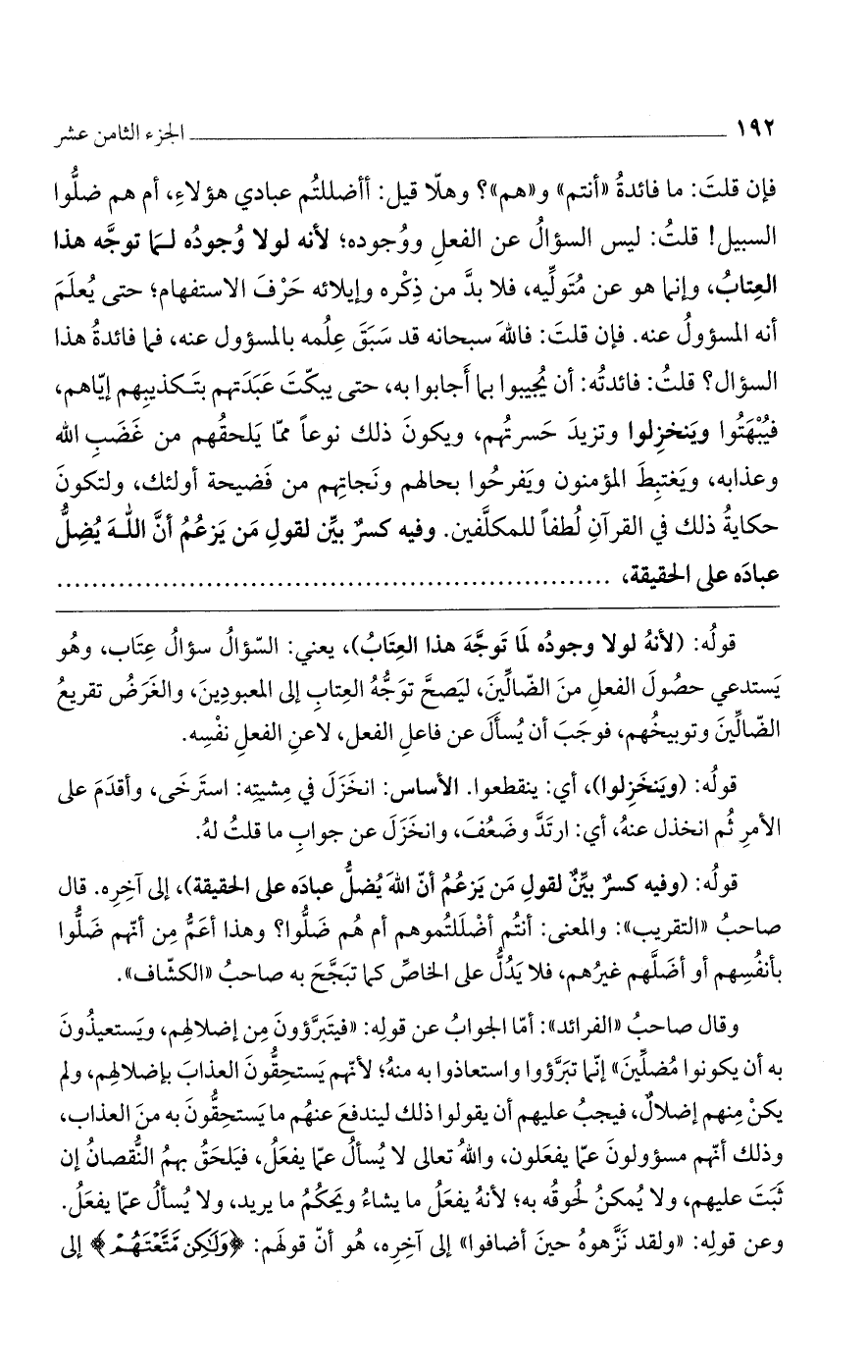 وقال صاحب "الفرائد": أما الجواب عن قوله: "فيتبرؤون من إضلالهم، ويستعيذون به أن يكونوا مضلين" إنما تبرؤوا واستعاذوا به منه، لأنهم يستحقون العذاب بإضلالهم، ولم لكن منهم إضلالٌ، فيجب عليهم أن يقولوا ذلك ليندفع عنهم ما يستحقون به من العذاب، وذلك أنهم مسؤولون عما يفعلون، والله تعالى لا يسأل عما يفعل، فيلحق بهم النقصان إن ثبت عليهم، ولا يمكن لحوقه به، لأنه يفعل ما يشاء ويحكم ما يريد، ولا يسأل عما يفعل. وعن قوله: "ولقد نزهوه حين أضافوا" إلى آخره، هو أن قولهم: {وَلَكِنْ مَتَّعْتَهُمْ} إلى