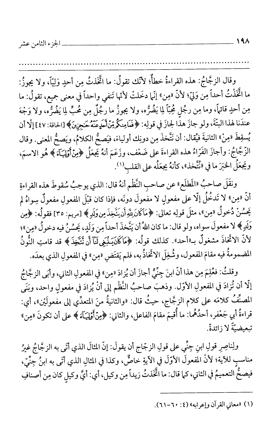 وقال الزجاج: هذه القراءة خطأٌ، لأنك تقول: ما اتخذت من أحدٍ ولياً، ولا يجوز: ما اتخذت أحداً من ولي، لأن "من" إنما دخلت لأنها تنفي واحداً في معنى جميع، تقول: ما من أحدٍ قائماً، وما من رجلٍ محباً لما يضره، ولا يجوز ما رجلٌ من محبٍّ لما يضره، ولا وجه عندنا لهذا البتة، ولو جاز هذا لجاز في قوله: {فَمَا مِنْكُمْ مِنْ أَحَدٍ عَنْهُ حَاجِزِينَ} [الحاقة: 47] إلا أن يسقط "من" الثانية فيقال: أن نتخذ من دونك أولياء، فيصح الكلام، ويصح المعنى. وقال الزجاج: وأجاز الفراء هذه القراءة على ضعف، وزعم أنه يجعل {مِنْ أَوْلِيَاءَ} هو الاسم، ويجعل الخبر ما في "نتخذ"، كأنه يجعله على القلب.