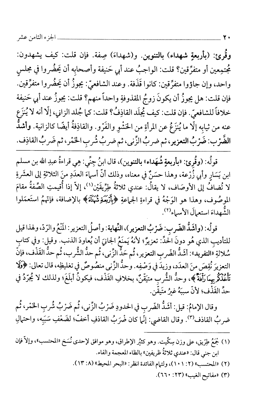 وقرئ: (بأربعة شهداء) بالتنوين. و (شهداء) صفة. فإن كنت: كيف يشهدون: مجتمعين أو متفرقين؟ قلت: الواجب عند أبي حنيفة وأصحابه أن يحضروا في مجلسي واحد، وإن جاؤوا متفرقين: كانوا قذفة، . وعند الشافعي: يجوز أن يحضروا متفرقين. فإن قلت: هل يجوز أن يكون زوج المقذوفة واحداً منهم؟ قلت: يجوز عند أبي حنيفة خلافاً للشافعي. فإن قلت: كيف يجلد القاذف؟ قلت: كما جلد الزاني، إلا أنه لا ينزع عنه من ثيابه إلا ما ينزع عن المرأة من الحشو والفرو. والقاذفة أيضًا كالزانية. وأشد الضرب: ضرب التعزيز، ثم ضرب الزنى، ثم ضرب شرب الخمر، ثم ضرب القاذف.