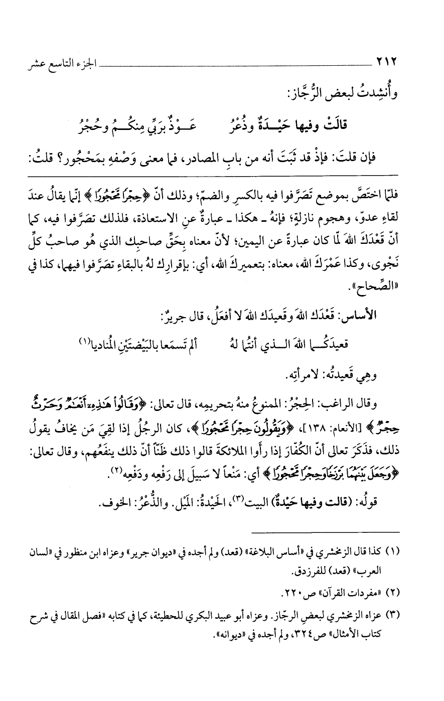 وقال الراغب: الحجر: الممنوع منه بتحريمه، قال تعالى: {وَقَالُوا هَذِهِ أَنْعَامٌ وَحَرْثٌ حِجْرٌ} [الأنعام: 138]، {وَيَقُولُونَ حِجْرًا مَحْجُورًا}، كان الرجل إذا لقي من يخاف يقول ذلك، فذكر تعالى أن الكفار إذا رأوا الملائكة قالوا ذلك ظناً أن ذلك ينفعهم، وقال تعالى: {وَجَعَلَ بَيْنَهُمَا بَرْزَخًا وَحِجْرًا مَحْجُورًا} أي: منعاً لا سبيل إلى رفعه ودفعه.