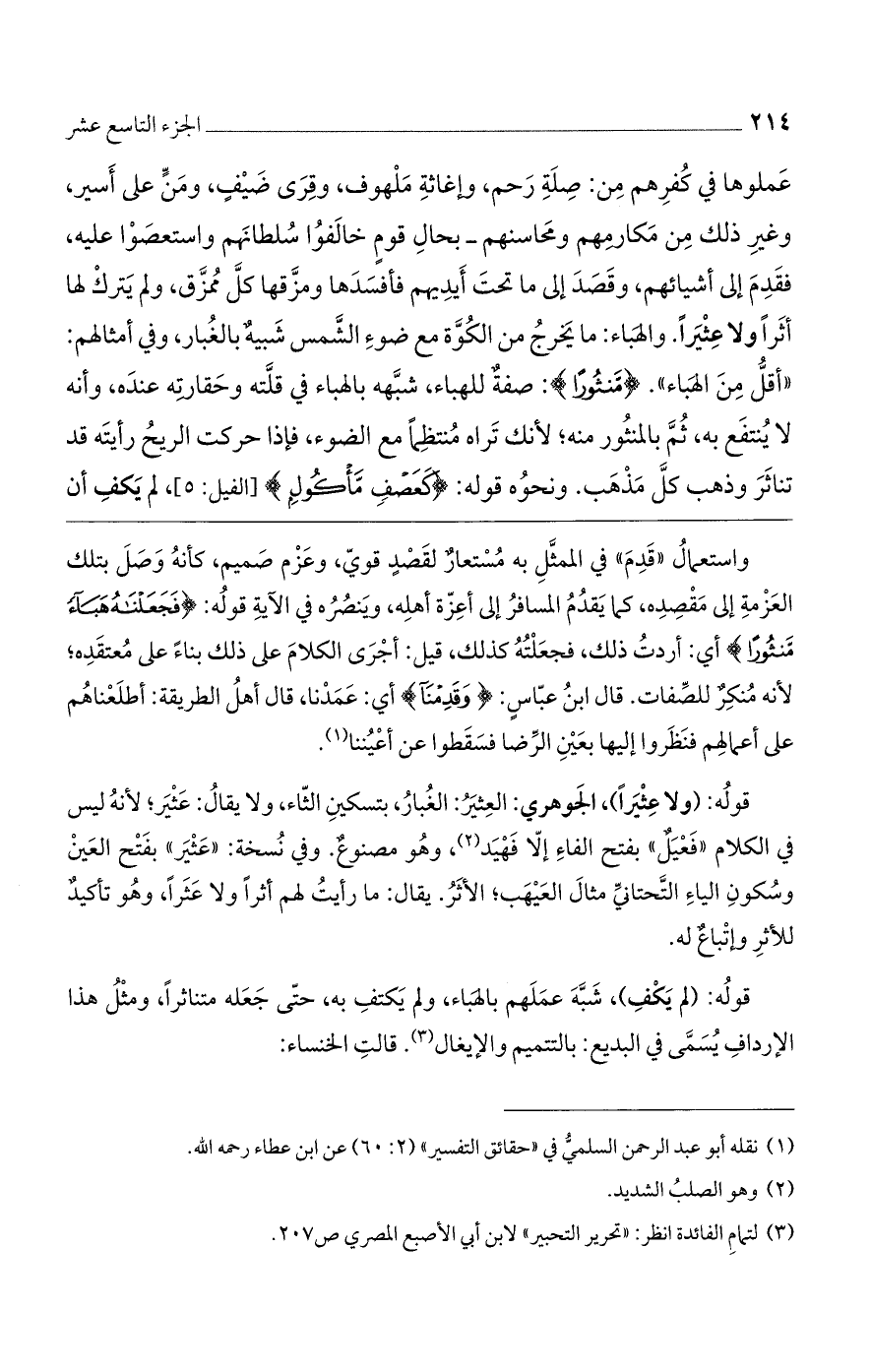 قوله: (لم يكف)، شبه عملهم بالهباء، ولم يكتف به، حتى جعله متناثراً، ومثل هذا الإرداف يسمى في البديع: بالتتميم والإيغال. قالت الخنساء: