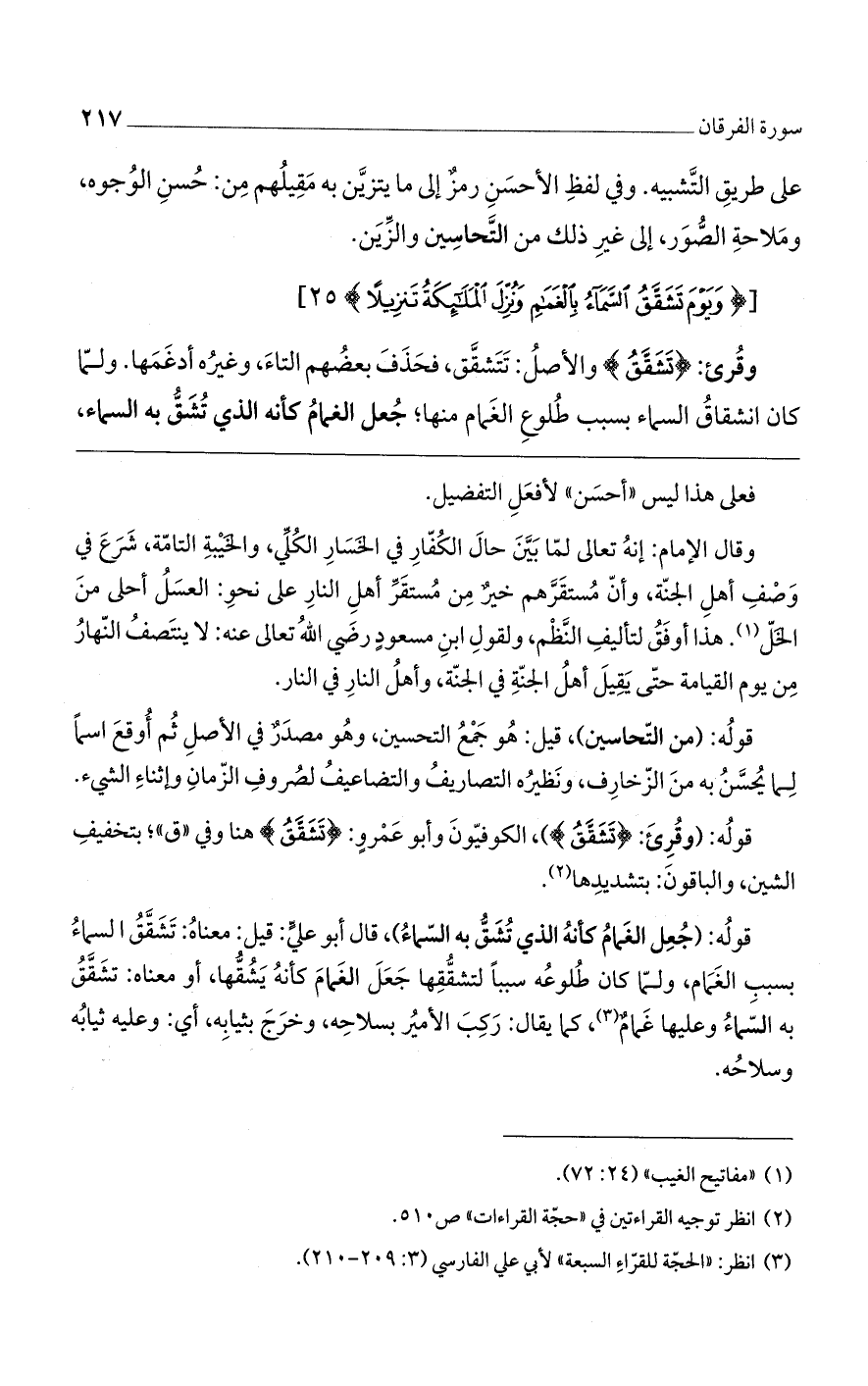 وقرئ: (تَشَقَّقُ) والأصل: تتشقق، فحذف بعضهم التاء، وغيره أدغمها. ولما كان انشقاق السماء بسبب طلوع الغمام منها، جعل الغمام كأنه الذي تشق به السماء،