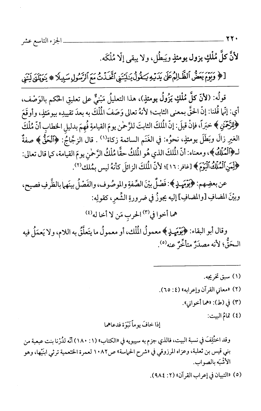 قوله: (لأن كل ملكٍ يزول يومئذٍ)، هذا التعليل مبنيٌ على تعليق الحكم بالوصف، أي: إنما قلنا: إن الحق بمعنى الثابت، لأنه تعالى وصف الملك به بعد تقييده بيومئذٍ، وأوقع {لِلرَّحْمَنِ} خبراً، فإن قيل: إن الملك الثابت للرحمن يوم القيامة فهم بدليل الخطاب أن ملك الغير زال وبطل يومئذٍ، نحوه: في الغنم السائمة زكاة. قال الزجاج: {الْحَقِّ} صفةٌ لـ {الْمَلِكُ}، ومعناه: أن الملك الذي هو الملك حقًا ملك الرحمن يوم القيامة، كما قال تعالى: {لِمَنِ الْمُلْكُ الْيَوْمَ} [غافر: 16]، لأن الملك الزائل كأنه ليس بملك.