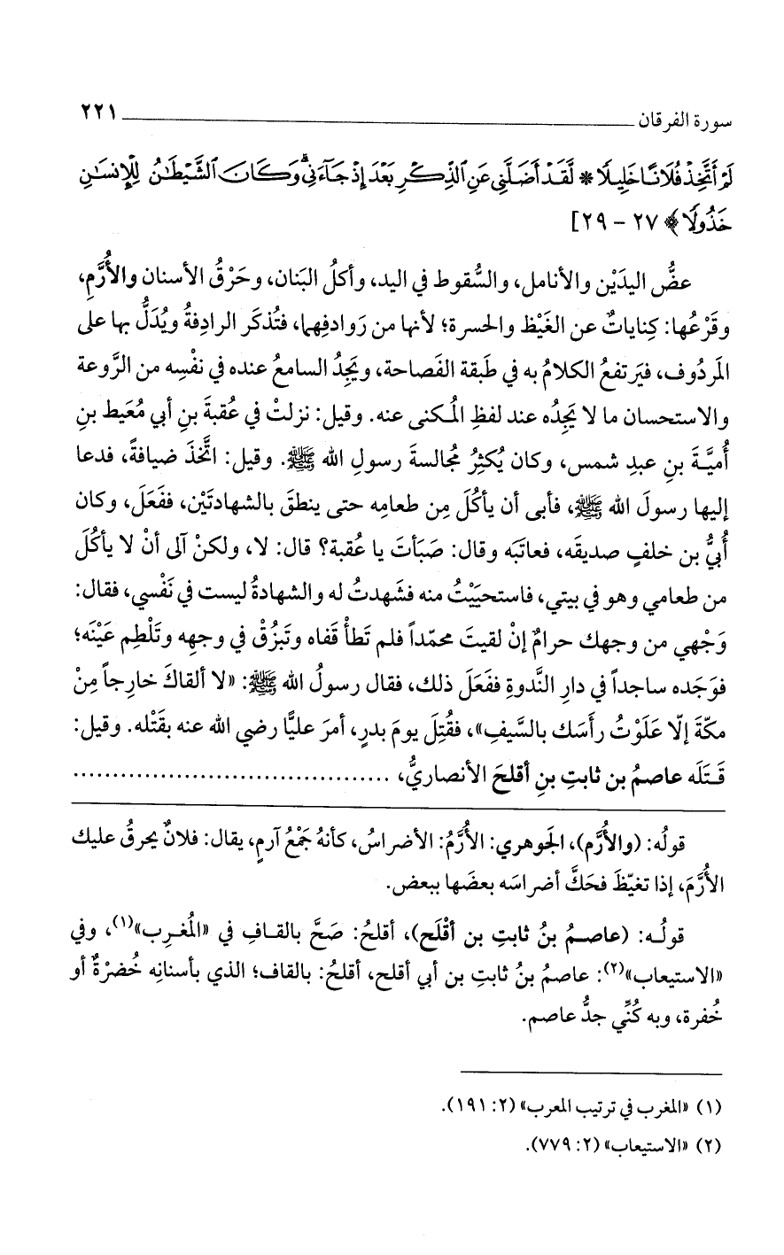 عض اليدين والأنامل، والسقوط في اليد، وأكل البنان، وحرق الأسنان والأرم، وقرعها: كنايات عن الغيظ والحسرة، لأنها من روادفها، فيذكر الرادفة ويدل بها على المردوف، فيرتفع الكلام به في طبقة الفصاحة، ويجد السامع عنده في نفسه من الروعة والاستحسان ما لا يجده عند لفظ المكنى عنه. وقيل: نزلت في عقبة بن أبى معيط بن أمية بن عبد شمس، وكان يكثر مجالسة رسول الله صلى الله عليه وسلم. وقيل اتخذ ضيافة فدعا إليها رسول الله صلى الله عليه وسلم، فأبى أن يأكل من طعامه حتى ينطق بالشهادتين، ففعل وكان أبى بن خلف صديقه فعاتبه وقال: صبأت يا عقبة؟ قال: لا، ولكن آلى أن لا يأكل من طعامي وهو في بيتي، فاستحييت منه فشهدت له والشهادة ليست في نفسي، فقال: وجهى من وجهك حرام إن لقيت محمدا فلم تطأ قفاه وتبزق في وجهه وتلطم عينه، فوجده ساجدا في دار الندوة ففعل ذلك. فقال النبي صلى الله عليه وسلم: "لا ألقاك خارجا من مكة إلا علوت رأسك بالسيف"، فقتل يوم بدر: أمر عليا رضي الله عنه بقتله. وقيل: قتله عاصم بن ثابت بن أقلح الأنصاري