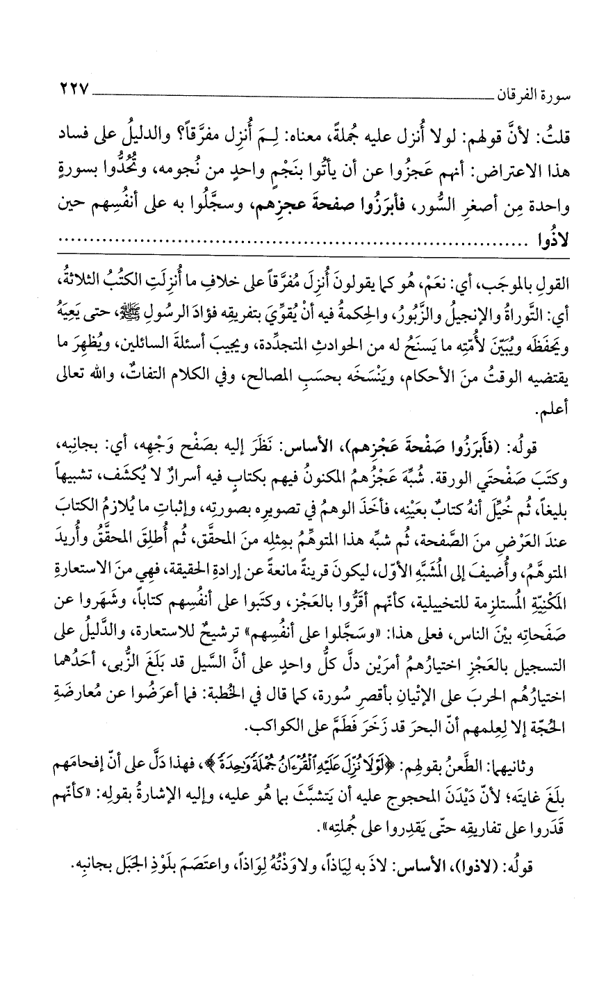 وثانيهما: الطعن بقولهم: {لَوْلَا نُزِّلَ عَلَيْهِ الْقُرْآَنُ جُمْلَةً وَاحِدَةً}، فهذا دل على أن إفحامهم بلغ غايته، لأن ديدان المحجوج عليه أن يتشبث بما هو عليه، وإليه الإشارة بقوله: "كأنهم قدروا على تفاريقه حتى يقدروا على جملته".