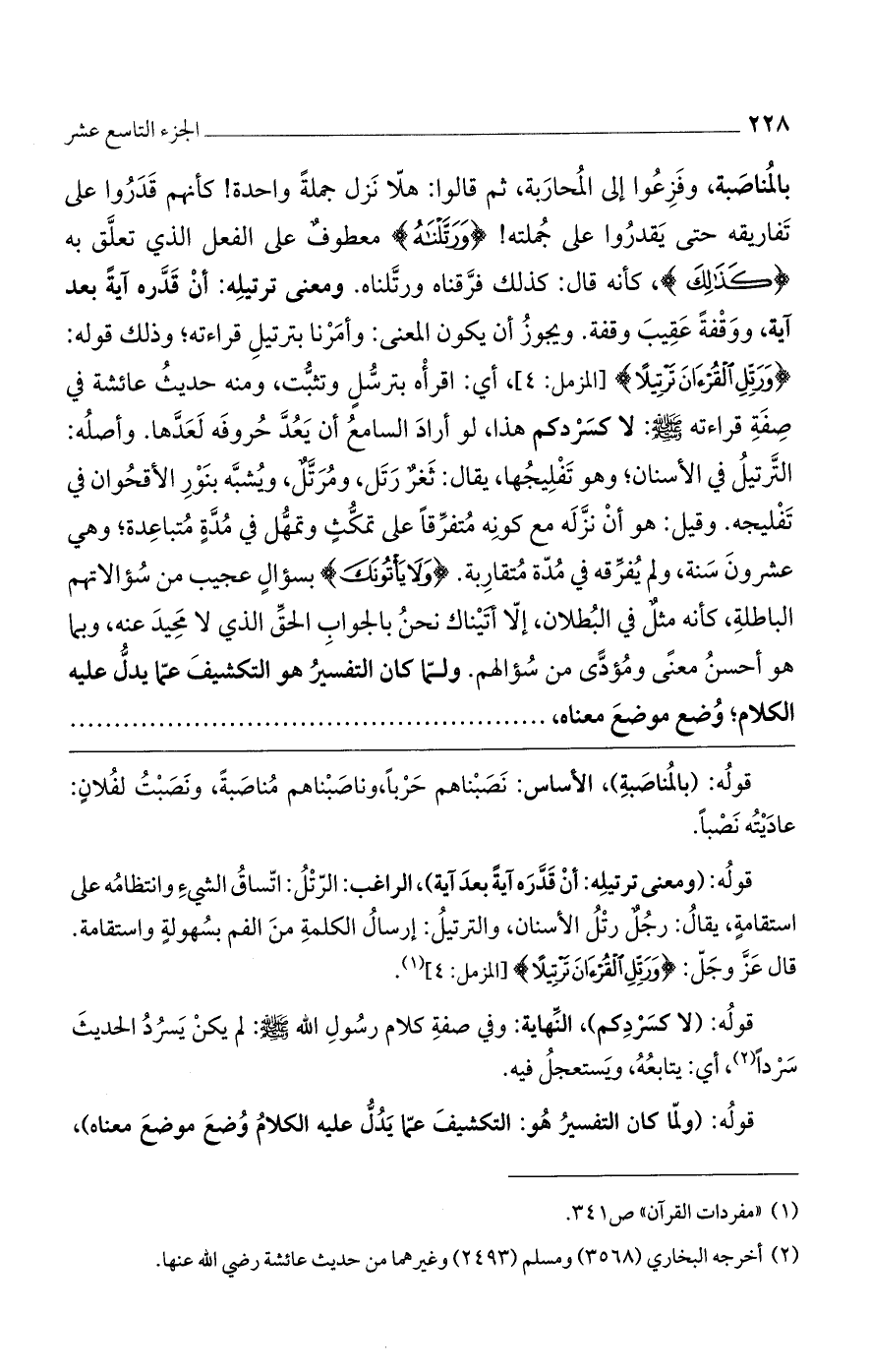 قوله: (ومعنى ترتيله: أن قدرة آية بعد آية)، الراغب: الرتل: اتساق الشيء وانتظامه على استقامةٍ، يقال: رجلٌ رتل الأسنان، والترتيل: إرسال الكلمة من الفم بسهولةٍ واستقامة. قال عز وجل: {وَرَتِّلِ الْقُرْآَنَ تَرْتِيلًا} [المزمل: 4].