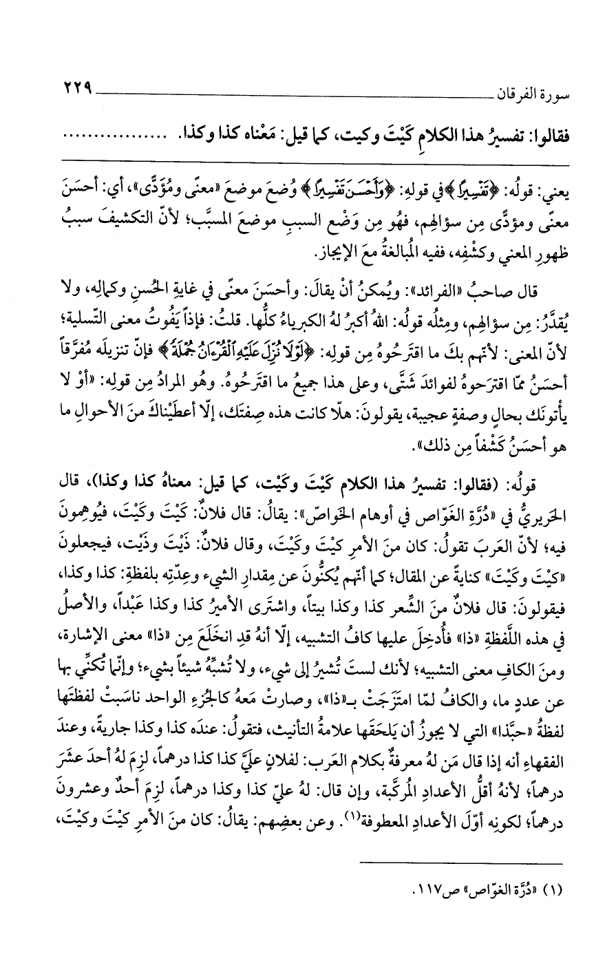 قوله: (فقالوا: تفسير هذا الكلام كيت وكيت، كما قيل: معناه كذا وكذا)، قال الحريري في "درة الغواص في أوهام الخواص": يقال: قال فلانٌ: كيت وكيت، فيوهمون فيه، لأن العرب تقول: كان من الأمر كيت وكيت، وقال فلانٌ: ذيت وذيت، فيجعلون "كيت وكيت كنايةً عن المقال، كما أنهم يكنون عن مقدار الشيء وعدته بلفظة: كذا وكذا، فيقولون: قال فلانٌ من الشعر كذا وكذا بيتاً، واشترى الأمير كذا وكذا عبداً، والأصل في هذه اللفظة "ذا" فأدخل عليها كاف التشبيه، إلا أنه قد انخلع من "ذا" معنى الإشارة، ومن الكاف معنى التشبيه، لأنك لست تشير إلى شيء، ولا تشبه شيئاً بشيء، وإنما تكني بها عن عددٍ ما، والكاف لما امتزجت بـ "ذا"، وصارت معه كالجزء الواحد ناسبت لفظتها لفظة "حبذا" التي لا يجوز أن يلحقها علامة التأنيث، فتقول: عنده كذا وكذا جاريةً، وعند الفقهاء أنه إذا قال من له معرفةٌ بكلام العرب: لفلانٍ علي كذا كذا درهماً، لزم له أحد عشر درهماً، لأنه أقل الأعداد المركبة، وإن قال: له علي كذا وكذا درهماً، لزم أحدٌ وعشرون درهماً، لكونه أول الأعداد المعطوفة. وعن بعضهم: يقال: كان من الأمر كيت وكيت.