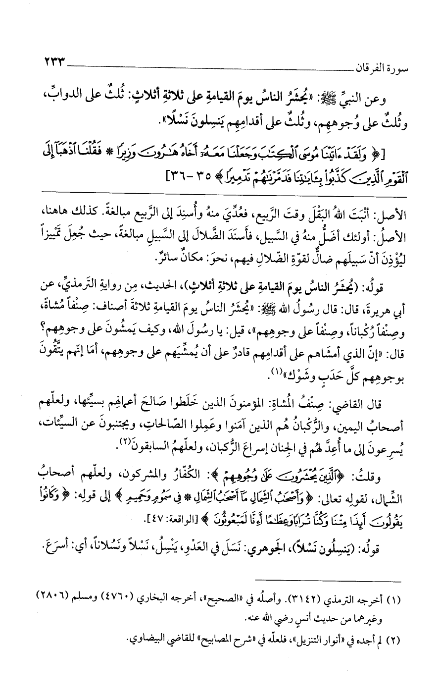 وقلت: {الَّذِينَ يُحْشَرُونَ عَلَى وُجُوهِهِمْ}: الكفار والمشركون، ولعلهم أصحاب الشمال، لقوله تعالى: {وَأَصْحَابُ الشِّمَالِ مَا أَصْحَابُ الشِّمَالِ (41) فِي سَمُومٍ وَحَمِيمٍ} إلى قوله: {وَكَانُوا يَقُولُونَ أَئِذَا مِتْنَا وَكُنَّا تُرَابًا وَعِظَامًا أَئِنَّا لَمَبْعُوثُونَ} [الواقعة: 47].