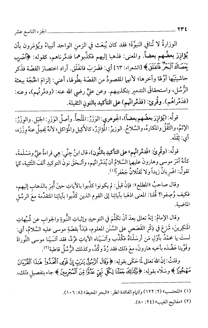 الوزارة لا تنافي النبوّة، فقد كان يبعث في الزمن الواحد أنبياء ويؤمرون بأن يوازر بعضهم بعضا. والمعنى: فذهبا إليهم فكذبوهما فدمرناهم، كقوله: (اضْرِبْ بِعَصاكَ الْبَحْرَ فَانْفَلَقَ) [الشعراء: 63] أي: فضرب فانفلق. أراد اختصار القصة فذكر حاشيتيها أوّلها وآخرها، لأنهما المقصود من القصة بطولها أعني: إلزام الحجة ببعثة الرسل، واستحقاق التدمير بتكذيبهم. وعن علي رضي الله عنه: (ودمَّرتُهم)، وعنه: (فدَمِّراهُم). وقرئ (فدمّرانّهم) على التأكيد بالنون الثقيلة.