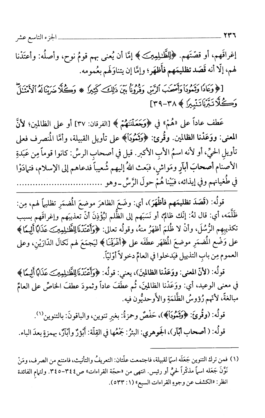 (وثَمُودَا) على تأويله القبيلة، وأما المنصرف فعلى تأويل الحي، أو لأنه اسم الأب الأكبر. قيل في أصحاب الرس: كانوا قوما من عبدة الأصنام أصحاب آبار ومواش، فبعث الله إليهم شعيبا فدعاهم إلى الإسلام. فتمادوا في طغيانهم وفي إيذائه. فبيناهم حول الرس وهو