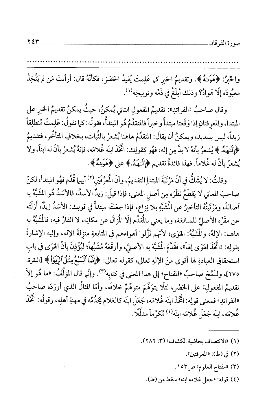 وقال صاحب "الفرائد": تقديم المفعول الثاني يمكن، حيث يمكن تقديم الخبر على المبتدأ، والمعرفتان إذا وقعتا مبتدأ وخبراً فالمتقدم هو المبتدأ، فقوله: كما تقول: علمت منطلقاً زيداً، ليس بسديد، ويمكن أن يقال: المتقدم هاهنا يشعر بالثبات، بخلاف المتأخر، فتقديم {إِلَهَهُ}، على {هَوَاهُ}.
