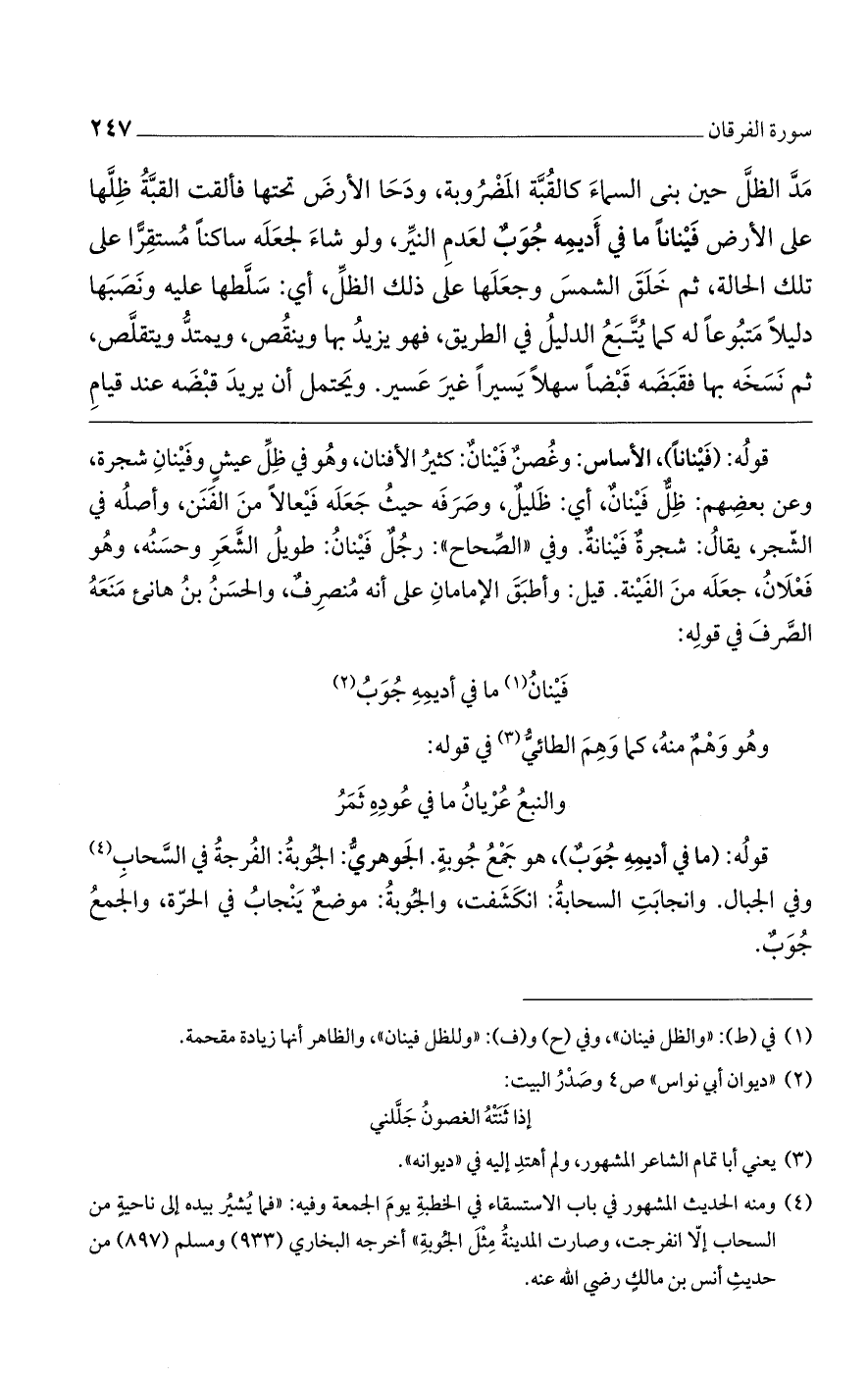 قوله: (فيناناً)، الأساس: وغصنٌ فينانٌ: كثير الأفنان، وهو في ظل عيشٍ وفينان شجرة، وعن بعضهم: ظلٌ فينانٌ، أي: ظليلٌ، وصرفه حيث فيعالاً من الفنن، وأصله في الشجر، يقال: شجرةٌ فينانةٌ. وفي "الصحاح": رجلٌ فينان: طويل الشعر وحسنه، وهو فعلان، جعله من الفينة. قيل: وأطبق الإمامان على أنه منصرفٌ، والحسن بن هانئ منعه الصرف في قوله: