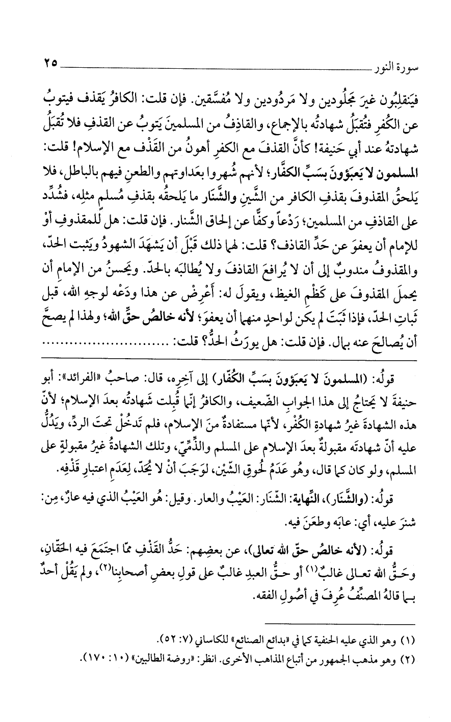 فينقلبون غير مجلودين ولا مردودين ولا مفسقين. فإن قلت: الكافر يقذف فيتوب عن الكفر فتقبل شهادته بالإجماع، والقاذف من المسلمين يتوب عن القذف فلا تقبل شهادته عند أبي حنيفة! كأن القذف مع الكفر أهون من القذف مع الإسلام! قلت: المسلمون لا يعبؤون بسبب الكفار، لأنهم شهروا بعداوتهم والطعن فيهم بالباطل، فلا يلحق المقذوف بقذف الكافر من الشين والشنار ما يحلقه بقذف مسلم مثله، فشدد على القاذف من المسلمين، ردعاً وكفًأ عن إلحاق الشنار. فإن قلت: هل للمقذوف أو للإمام أن يعفو عن حد القاذف؟ قلت: لهما ذلك قبل أن يشهد الشهود ويثبت الحد، والمقذوف مندوبٌ إلى أن لا يرافع القاذف ولا يطالبه بالحد. ويحسن من الإمام أن يحمل المقذوف على كظم الغيظ، ويقول له: أعرض عن هذا ودعه لوجه الله، قبل ثبات الحد، فإذا ثبت لم يكن لواحدٍ منهما أن يعفو، لأنه خالص حق الله، ولهذا لم يصح أن يصالح عنه بمال. فإن قلت: هل يورث الحد؟ قلت: .....