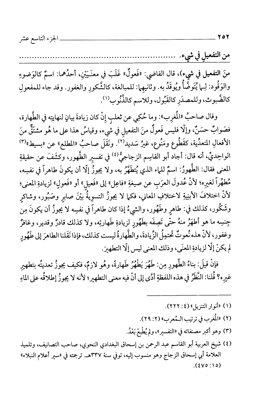 وقال صاحب "المغرب": وما حكي عن ثعلبٍ إن كان زيادة بيانٍ لنهايته في الطهارة، فصواب حسنٌ، وإلا فليس فعولٌ من التفعيل في شيء، وقياس هذا على ما هو مشتق من الأفعال المتعدية، كقطوع ومنوع، غير سديد. ونقل صاحب "المطلع" عن "بسيط" الواحدي، أنه قال: أجاد أبو القاسم الزجاجي في تفسير الطهور، وكشف عن حقيقة المعنى فقال: الطهور: اسمٌ للماء الذي يتطهر به، ولا يجوز إلا أن يكون طاهراً في نفسه، مطهراً لغيره، لأن عدول العرب عن صيغة "فاعل" إلى "فعيل" أو "فعولٍ" لزيادة المعنى، لأن اختلاف الأبنية لاختلاف المعاني، فكما لا يجوز التسوية بين صابرٍ وصبور، وشاكرٍ، كذلك في: طاهرٍ وطهور، والشيء إذا كان طاهراً في نفسه لا يجوز أن يكون من جنسه ما هو أطهر منه حتى تصفه بطهورٍ لزيادة طهارته، ولا كذلك قادرٌ وقدير، وغافرٌ وغفور، لأن هذه نعوتٌ تحتمل الزيادة، والطهارة ليست كذلك، فإذا نقلنا الطاهر إلى طهورٍ لم يكن إلا لزيادة المعنى، وذلك المعنى ليس إلا التطهير.