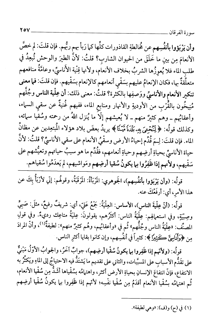 وأن يربؤوا بأنفسهم عن مخالطة القاذورات كلها كما ربأ بهم ربهم. فإن قلت: لم خص الأنعام من بين ما خلق من الحيوان الشارب؟ قلت: لأن الطير والوحش تبعد في طلب الماء فلا يعوزها الشرب بخلاف الأنعام، ولأنها قنية الأناسي، وعامة منافعهم متعلقة بها، فكان الإنعام عليهم بسقى أنعامهم كالإنعام بسقيهم. فإن قلت: فما معنى تنكير الأنعام والأناسي ووصفها بالكثرة؟ قلت: معنى ذلك أن عليه الناس وجلهم منيخون بالقرب من الأودية والأنهار ومنابع الماء، ففيهم غنية عن سقي السماء، وأعقابهم - وهم كثير منهم - لا يعيشهم إلا ما ينزل الله من رحمته وسقيا سمائه، وكذلك قوله: (لِنُحْيِيَ بِهِ بَلْدَةً مَيْتاً) يريد بعض بلاد هؤلاء المبتعدين عن مظان الماء. فإن قلت: لم قدم إحياء الأرض وسقى الأنعام على سقى الأناسي؟ قلت: لأنّ حياة الأناسىّ بحياة أرضهم وحياة أنعامهم، فقدم ما هو سبب حياتهم وتعيشهم على سقيهم، ولأنهم إذا ظفروا بما يكون سقيا أرضهم ومواشيهم، لم يعدموا سقياهم.