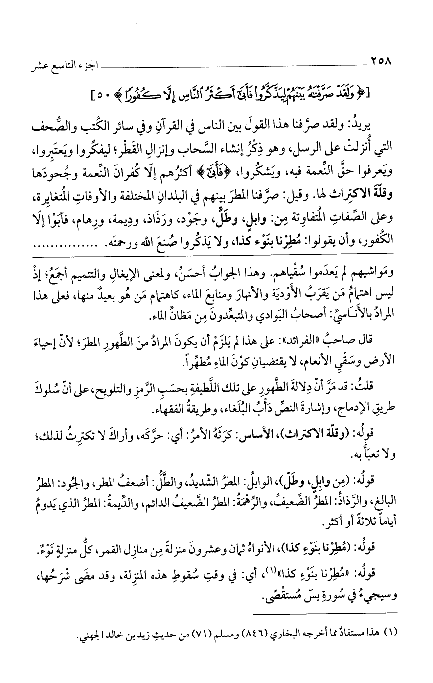 يريد: ولقد صرفنا هذا القول بين الناس في القرآن وفي سائر الكتب والصحف التي أنزلت على الرسل، وهو ذكر إنشاء السحاب وإنزال القطر؛ ليفكروا ويعتبروا، ويعرفوا حق النعمة فيه ويشكروا، (فَأَبى) أكثرهم إلا كفران النعمة وجحودها وقلة الاكتراث لها. وقيل: صرفنا المطر بينهم في البلدان المختلفة والأوقات المتغايرة، وعلى الصفات المتفاوتة من: وابل وطل، وجود ورذاذ، وديمة ورهام فأبوا إلا الكفور وأن يقولوا: مطرنا بنوء كذا، ولا يذكروا صنع الله ورحمته.