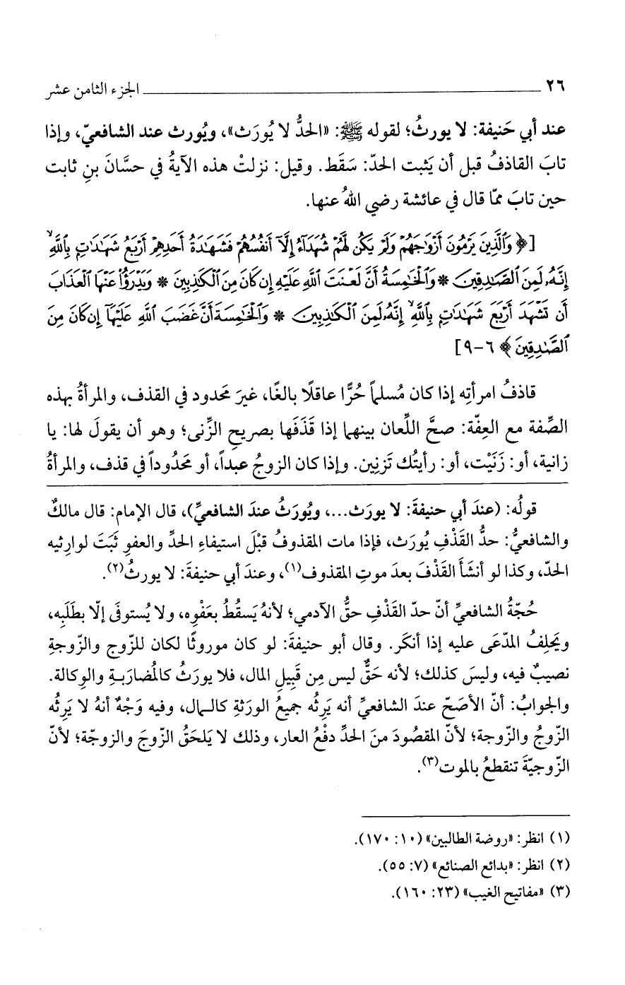 حجة الشافعي أن حد القذف الآدمي، لأنه يسقط بعفوه، ولا يستوفي إلا بطلبه، ويحلف المدعى عليه إذا أنكر، وقال أبو حنيفة: لو كان موروثاً لكان للزوج والزوجة نصيبٌ فيه، وليس كذلك، لأنه حقٌ ليس من قبيل المال، فلا يورث كالمضاربة والوكالة. والجواب: أن الأصح عند الشافعي أنه يرثه جميع الورثة كالمال، وفيه وجهٌ أنه لا يرثه الزوج والزوجة، لأن المقصود من الحد دفع العار، وذلك لا يلحق الزوج والزوجة، لأن الزوجية تنقطع بالموت.