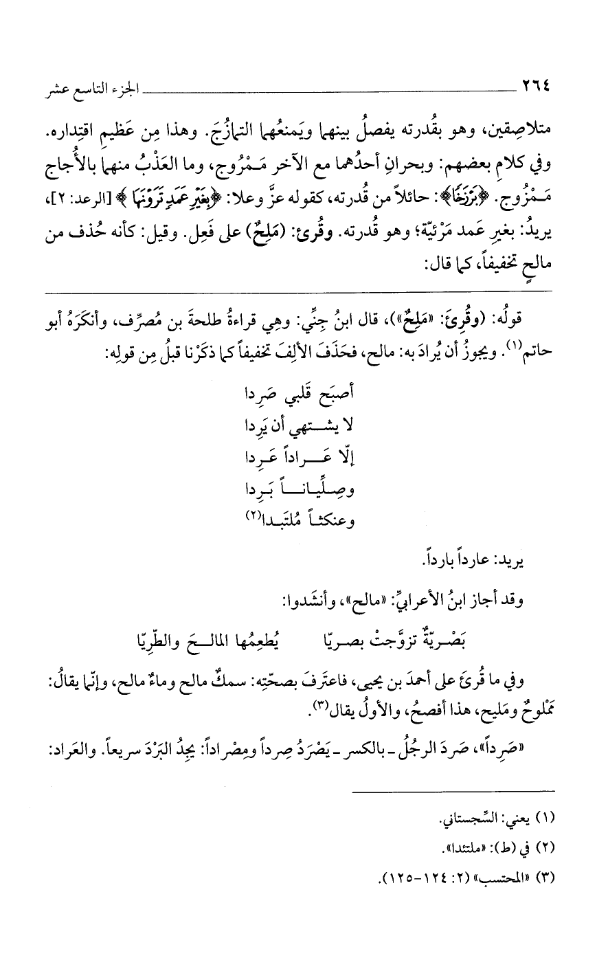 قوله: (وقرئ: "ملحٌ"، قال ابن جني: وهي قراءة طلحة بن مصرف، وأنكره أبو حاتم. ويجوز أن يراد به: مالح، فحذف الألف تخفيفاً كما ذكرنا قبل من قوله: