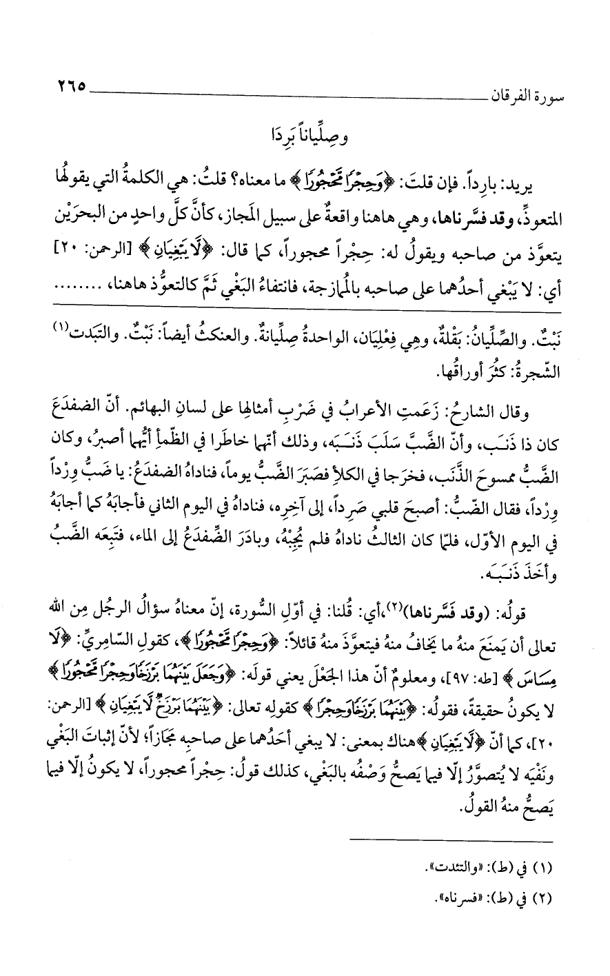 يريد: باردا: فإن قلت: (وَحِجْراً مَحْجُوراً) ما معناه؟ قلت: هي الكلمة التي يقولها المتعوذ، وقد فسرناها، وهي هاهنا واقعة على سبيل المجاز، كأن كل واحد من البحرين يتعوّذ من صاحبه ويقول له: حجرا محجورا، كما قال: (لا يَبْغِيانِ) [الرحمن: 20] أي: لا يبغي أحدهما على صاحبه بالممازجة، فانتفاء البغي ثمة كالتعوذ هاهنا،