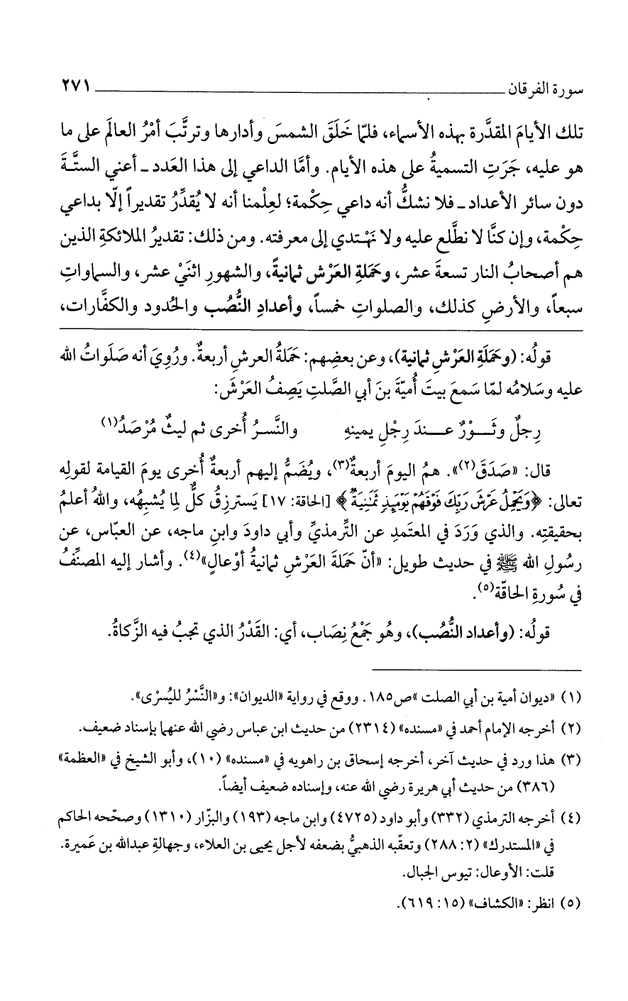 قال: "صدق". هم اليوم أربعةٌ، ويضم إليهم أربعةٌ أخرى يوم القيامة لقوله تعالى: {وَيَحْمِلُ عَرْشَ رَبِّكَ فَوْقَهُمْ يَوْمَئِذٍ ثَمَانِيَةٌ} [الحاقة: 17] يسترزق كلٌ لما يشبهه، والله أعلم بحقيقته. والذي ورد في المعتمد عن الترمذي وأبي داود وابن ماجه، عن العباس، عن رسول الله - صلى الله عليه وسلم - في حديث طويل: "أن حملة العرش ثمانية أو عالٍ". وأشار إليه المصنف في سورة الحاقة.