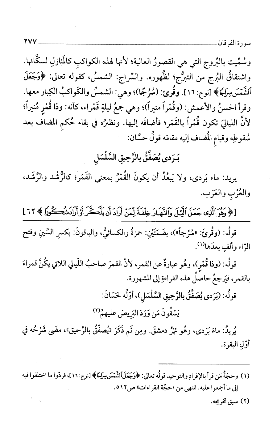 قوله: (وقرئ: "سرجاً")، بضمتين: حمزة والكسائي، والباقون: بكسر السين وفتح الراء وألفٍ بعدها.