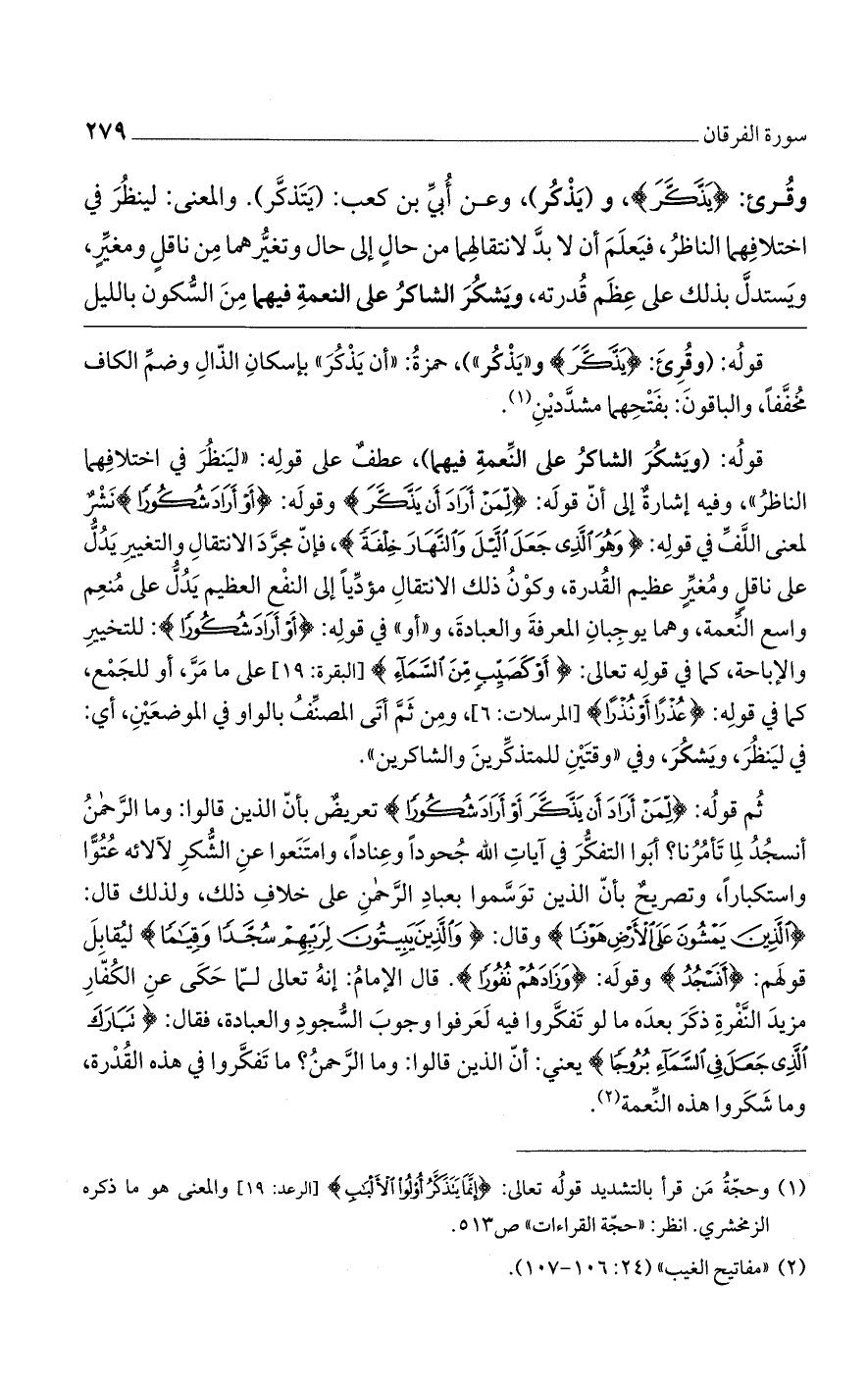 قوله: (وقرئ: {يَذَّكَّرَ} و"يذكر")، حمزة: "أن يذكر" بإسكان الذال وضم الكاف مخففاً، والباقون: بفتحهما مشددين.