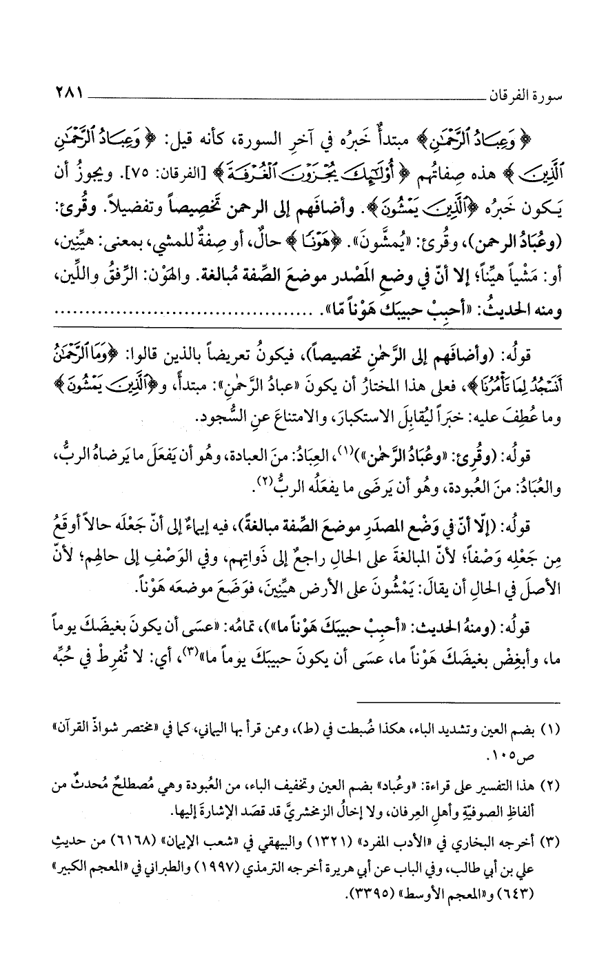 قوله: (وأضافهم إلى الرحمن تخصيصاً)، فيكون تعريضاً بالذين قالوا: {وَمَا الرَّحْمَنُ أَنَسْجُدُ لِمَا تَامُرُنَا}، فعلى هذا المختار أن يكون "عباد الرحمن": مبتدأ، و {الَّذِينَ يَمْشُونَ} وما عطف عليه: خبراً ليقابل الاستكبار، والامتناع عن السجود.