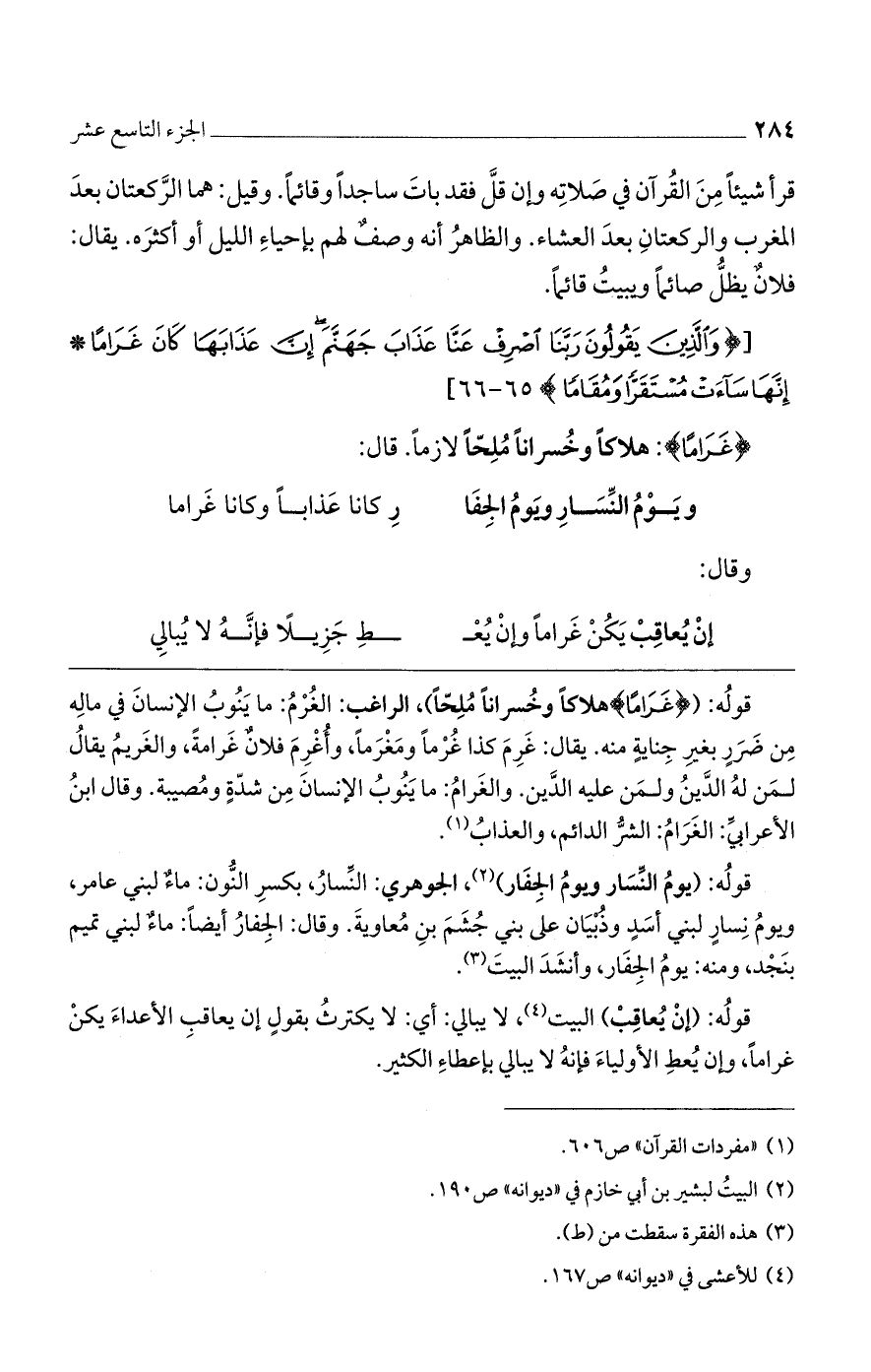قوله: ({غَرَامًا} هلاكاً وخسراناً ملحاً)، الراغب: الغرم: ما ينوب الإنسان في ما له من ضررٍ بغير جنايةٍ منه. يقال: غرم كذا غرماً ومغرماً، وأغرم فلانٌ غرامةً، والغريم يقال لمن له الدين ولمن عليه الدين. والغرام: ما ينوب الإنسان من شدةٍ ومصيبة. وقال ابن الأعرابي: الغرام: الشر الدائم، والعذاب.