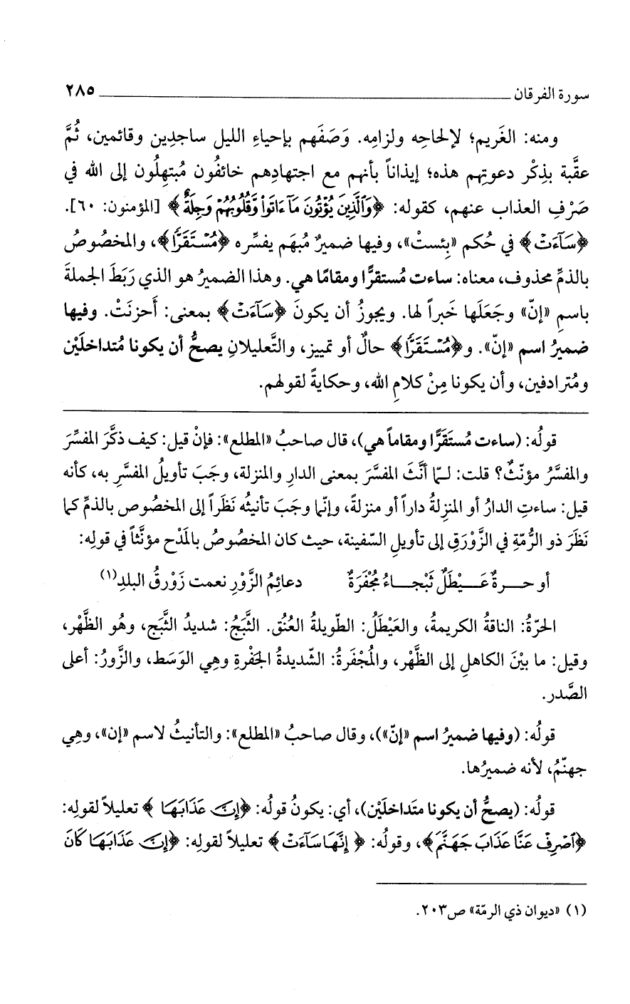 ومنه: الغريم؛ لإلحاحه ولزامه. وصفهم بإحياء الليل ساجدين وقائمين، ثم عقبه بذكر دعوتهم هذه، إيذانا بأنهم مع اجتهادهم خائفون مبتهلون إلى الله في صرف العذاب عنهم، كقوله تعالى: (وَالَّذِينَ يُؤْتُونَ ما آتَوْا وَقُلُوبُهُمْ وَجِلَةٌ) [المؤمنون: 60]. (سَاءَتْ) في حكم "بِئستْ" وفيها ضمير مبهم يفسره (مُسْتَقَرّا)، والمخصوص بالذم محذوف، معناه: ساءت مستقرّا ومقاما هي. وهذا الضمير هو الذي ربط الجملة باسم "إنّ" وجعلها خبرا لها. ويجوز أن يكون (سَاءَتْ) بمعنى: أحزنت. وفيها ضمير اسم "إنّ". و (مُسْتَقَرًّا) حال أو تمييز، والتعليلان يصح أن يكونا متداخلين ومترادفين، وأن يكونا من كلام الله وحكاية لقولهم.