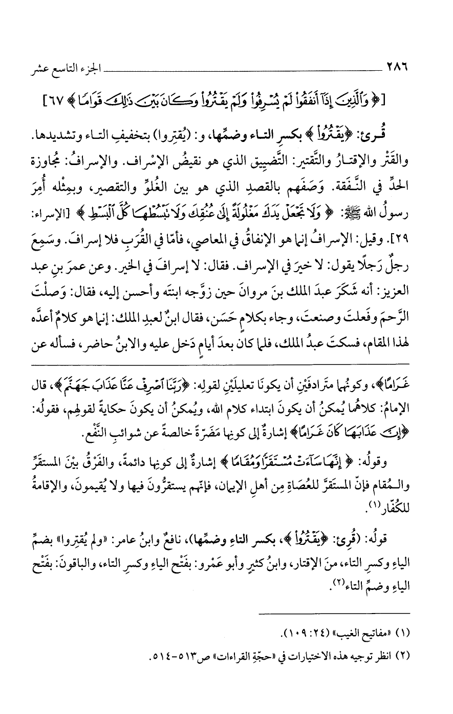 قوله: (قرئ: {يَقْتُرُوا}، بكسر التاء وضمها)، نافعٌ وابن عامر: "ولم يقتروا" بضم الياء وكسر التاء، من الإقتار، وابن كثيرٍ وأبو عمرو: بفتح الياء وكسر التاء، والباقون: بفتح الياء وضم التاء.