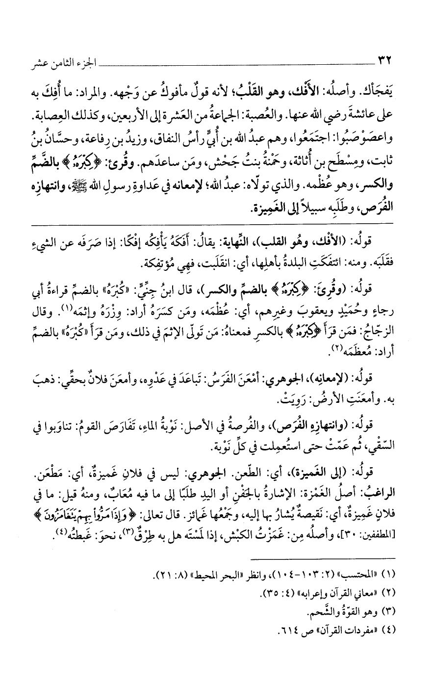 يفجأك. وأصله: الأفك، وهو القلب، لأنه قولٌ مأفوك عن وجهه. والمراد: ما أفك به على عائشة رضي الله عنها. والعصبة: الجماعة من العشرة إلى الأربعين، وكذلك العصابة. واعصوا صبوا: اجتمعوا، وهم عبد الله بن أبي رأس النفاق، وزيد بن رفاعة، وحسان بن ثابت، ومسطح بن أثاثة، وحمنة بنت جحش، ومن ساعدهم. وقرئ: {كِبْرَهُ} بالضم والكسر، وهو عظمة. والذي تولاه: عبد الله، لإمعانه في عداوة رسول الله - صلى الله عليه وسلم -، وانتهازه الفرص، وطلبه سبيلاً إلى الغميزة.