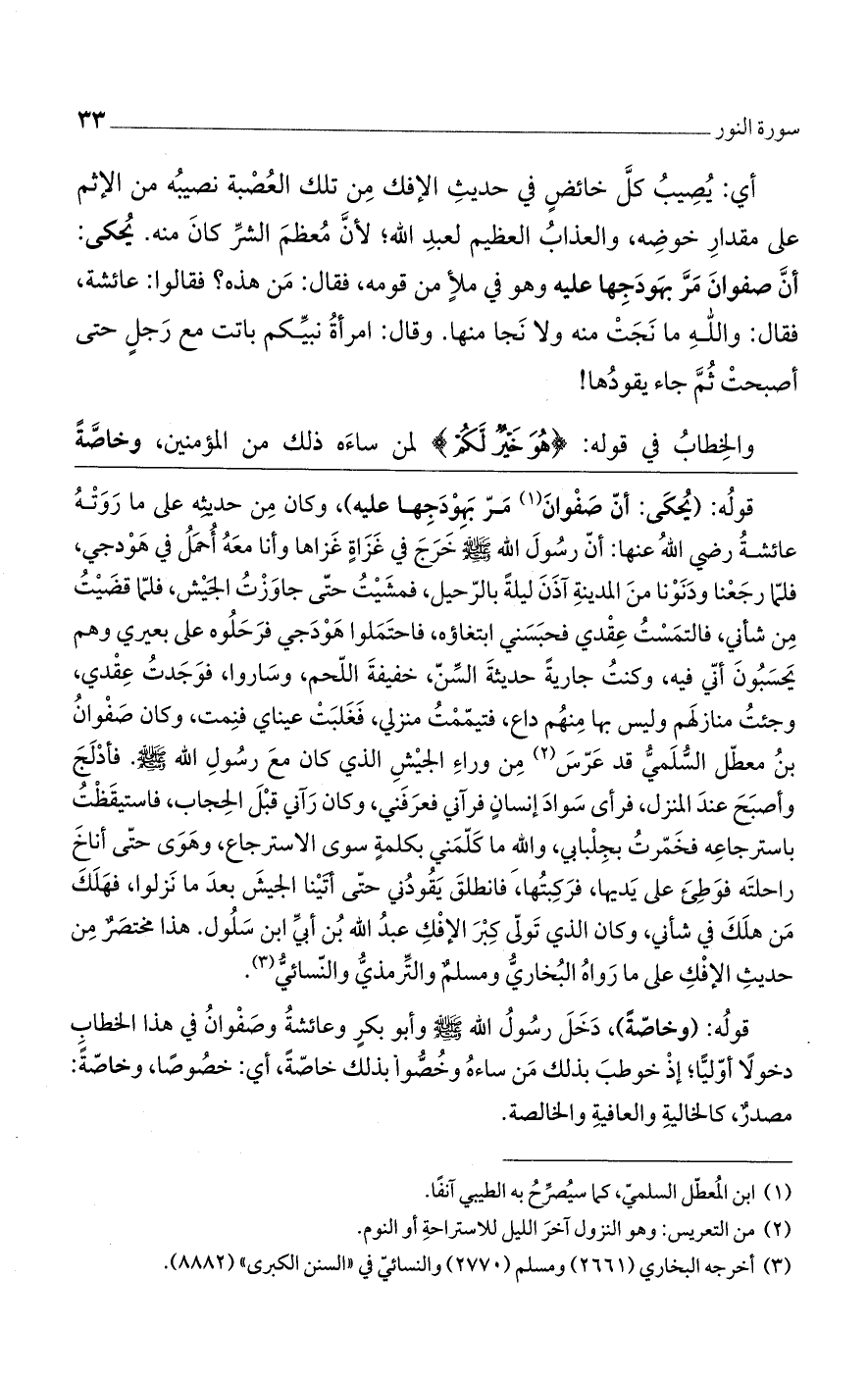 قوله: (وخاصة)، دخل رسول الله - صلى الله عليه وسلم - وأبو بكر وعائشة وصفوان في هذا الخطاب دخولًا أوليًا، غذ خوطب بذلك من ساءه وخصوا بذلك خاصةً، أي: خصوصاً، وخاصةً: مصدرٌ، كالخالية والعافية والخالصة.