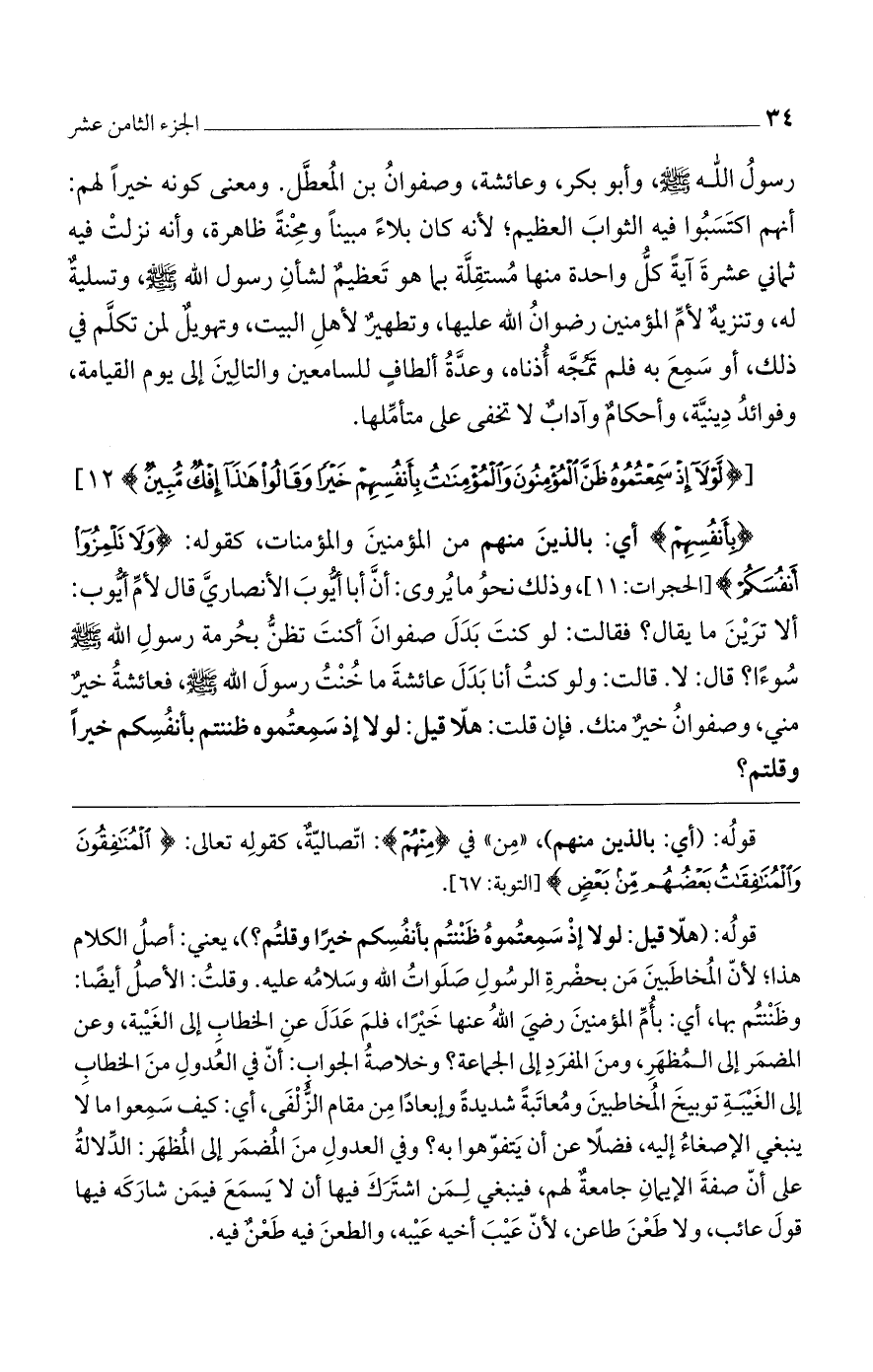 قوله: (هلا قيل: لولا إذ سمعتموه ظننتم بأنفسكم خيرًا وقلتم؟ ) يعني: أصل الكلام هذا، لأن المخاطبين من بحضرة الرسول صلوات الله وسلامه عليه. وقلت: الأصل أيضًا: وظننتم بها، أي: بأم المؤمنين رضي الله عنها خيرًا، فلم عدل عن الخطاب إلى الغيبة، وعن المضمر إلى المظهر، ومن المفرد إلى الجماعة؟ وخلاصة الجواب: أن في العدول من الخطاب إلى الغيبة توبيخ المخاطبين ومعاتبةً شديدةً وإبعادًا من مقام الزلفى، أي: كيف سمعوا ما لا ينبغي الإصغاء إليه، فضلًا عن أن يتفوهوا به؟ وفي العدول من المضمر إلى المظهر: الدلالة على أن صفة الإيمان جامعةٌ لهم، فينبغي لمن اشترك فيها أن لا يسمع فيمن شاركه فيها قول عائب، ولا طعن طاعن، لأن عيب أخيه عيبه، والطعن فيه طعنٌ فيه.