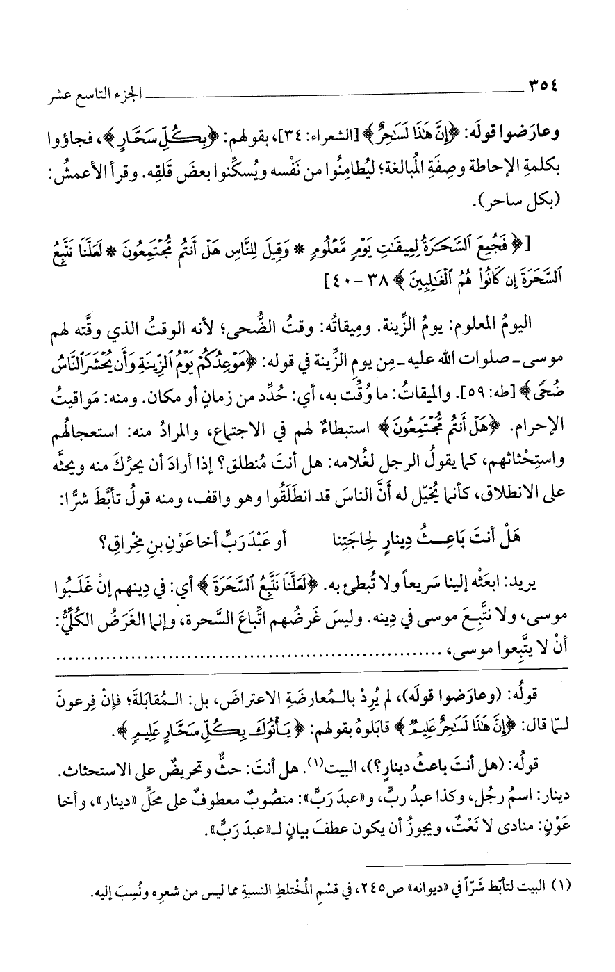 وعارضوا قوله: (إنَّ هَذَا لَسَاحِرٌ) [الشعراء: 34]، بقولهم: (بِكُلِّ سَحَّارٍ)، فجاءوا بكلمة الإحاطة وصفة المبالغة، ليطامنوا من نفسه ويسكنوا بعض قلقه. وقرأ الأعمش: (بكل ساحر).