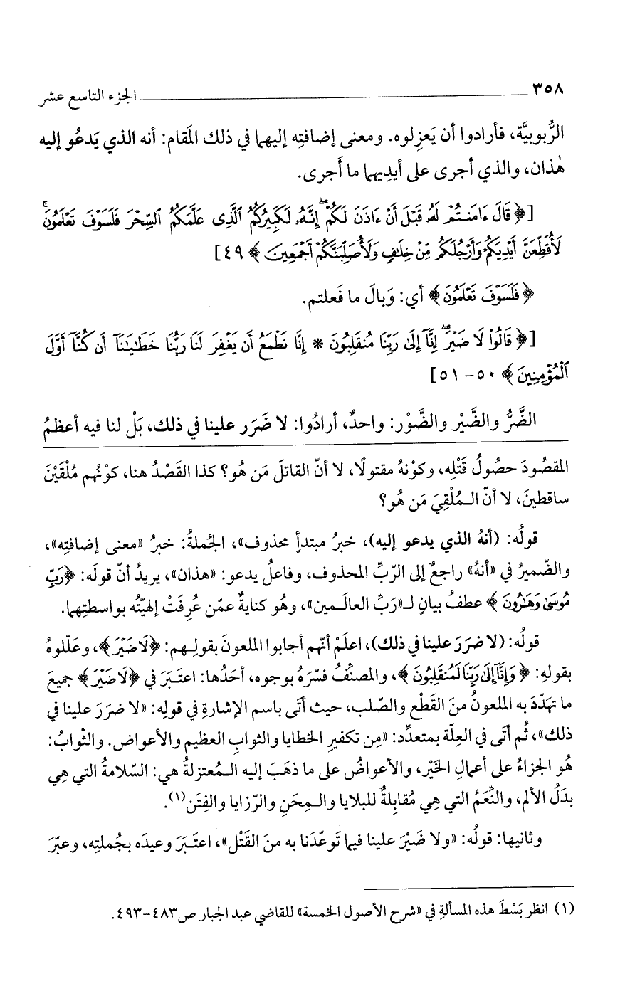 قوله: (لا ضرر علينا في ذلك)، اعلم أنهم أجابوا الملعون بقولهم: {لَا ضَيْرَ}، وعللوه بقوله: {وَإِنَّا إِلَى رَبِّنَا مُنْقَلِبُونَ}، والمصنف فسره بوجوه، أحدها: اعتبر في {لَا ضَيْرَ} جميع ما تهدد به المعلون من القطع والصلب، حيث أتى باسم الإشارة في قوله: "لا ضرر علينا في ذلك"، ثم أتى في العلة بمتعدد: "من تكفير الخطايا والثواب العظيم والأعواض. والثواب: هو الجزاء على أعمال الخير، والأعواض على ما ذهب إليه المعتزلة هي: السلامة التي هي بدل الألم، والنعم التي هي مقابلةٌ للبلايا والمحن والرزايا والفتن.
