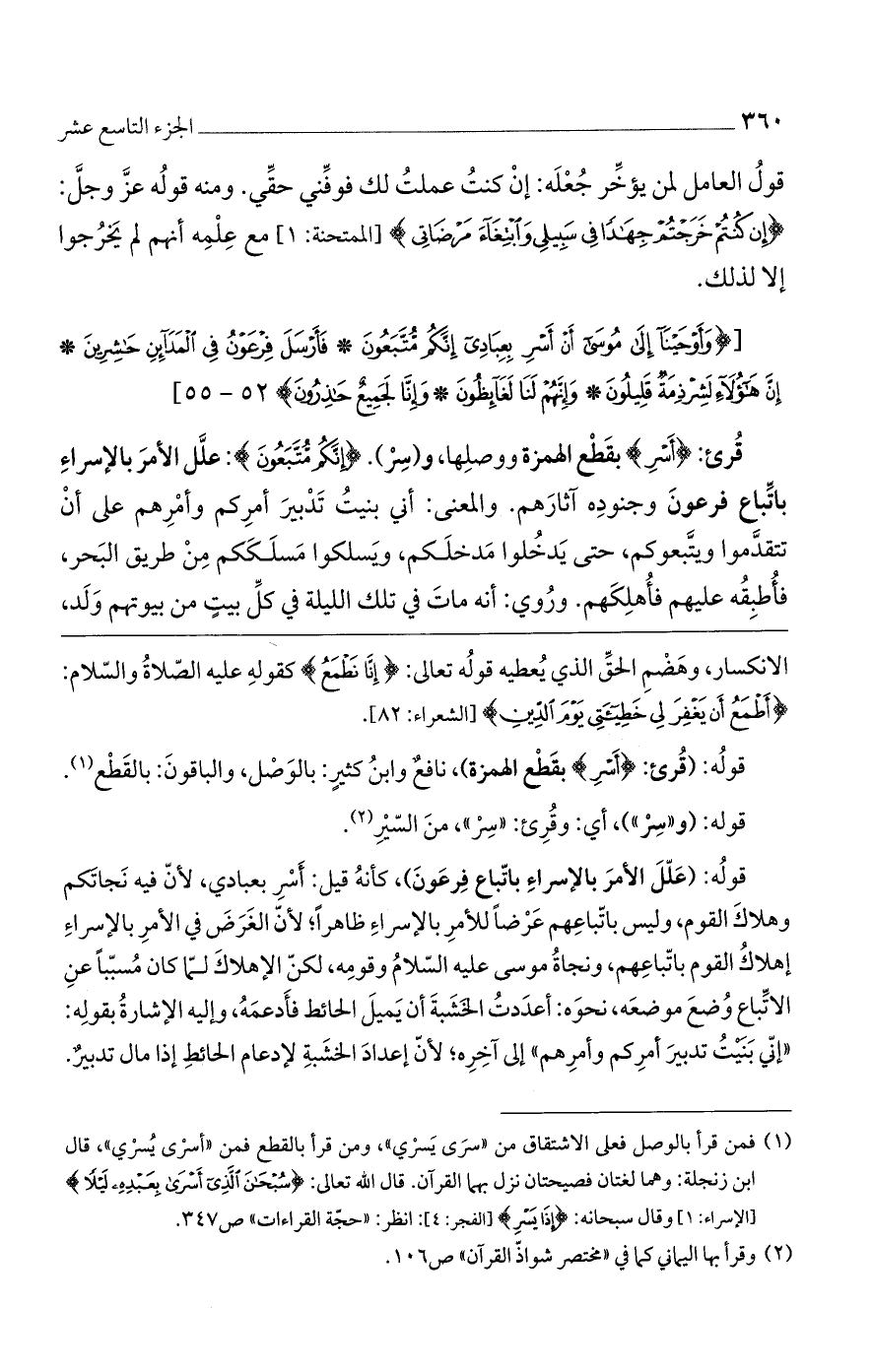قوله: (قرئ: {أَسْرِ} بقطع الهمزة، نافعٌ وابن كثيرٍ، بالوصل، والباقون: بالقطع.